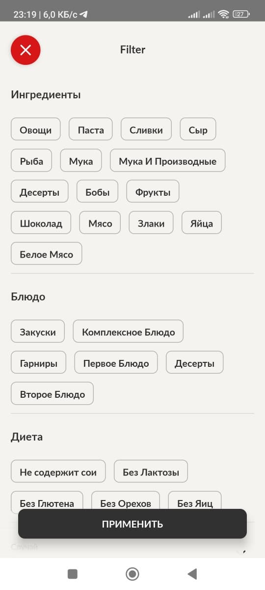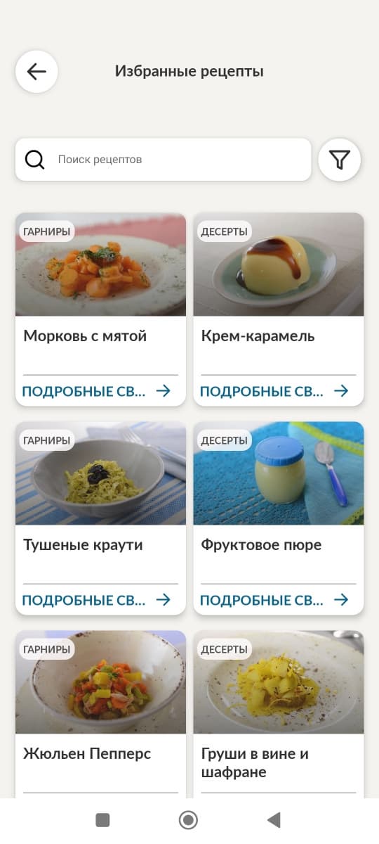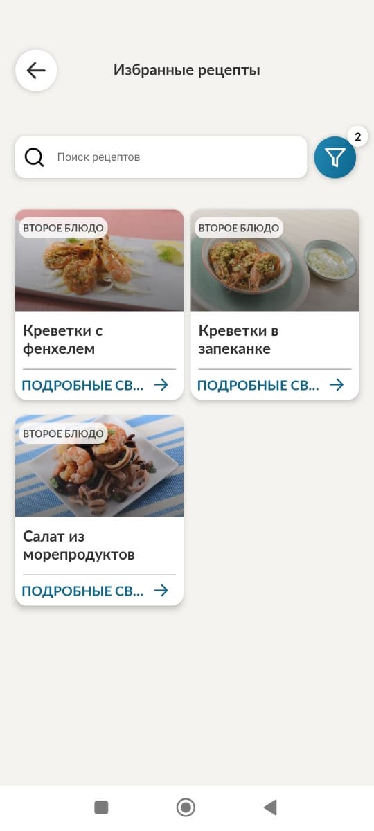 Допустим, мы выставили фильтр по двум категориям: блюда из рыбы и вторые блюда. Приложение предлагает нам следующие рецепты: