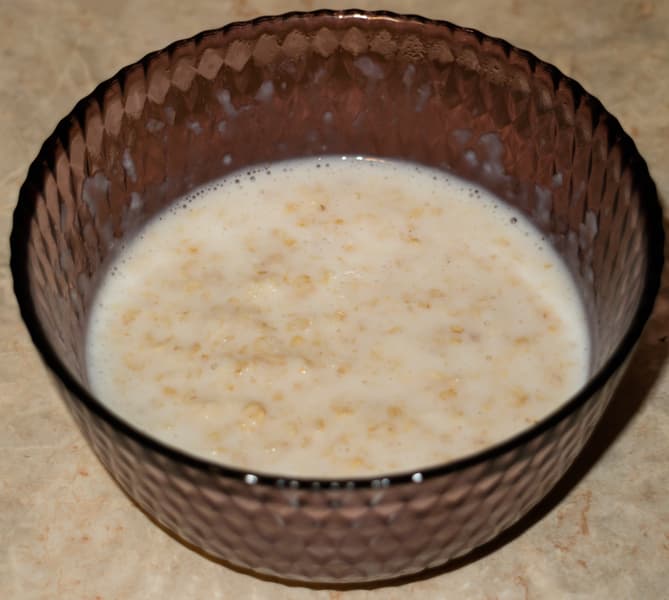 Изначально мы хотели воспользоваться автоматическим режимом А-08 «Овсянка» с возможностью сварить 50, 100 или 150 г. Но по ходу эксперимента стало ясно, что данный режим настроен для варки именно овсяной крупы, а не хлопьев. Поступили следующим образом: насыпали в миску 2 столовых ложки хлопьев (рекомендуемое время варки — 5 минут), залили 140 мл молока, разбавленного водой в пропорции примерно 1:1, и запустили программу А-08 с минимальным весом продукта.