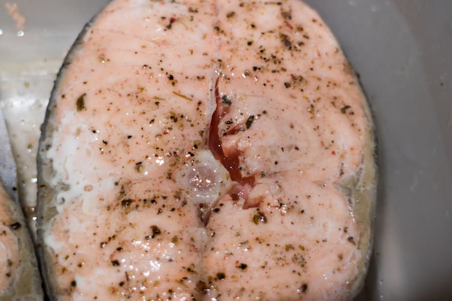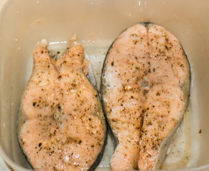 Через три минуты внешне рыба была готовой, но отделяя мякоть от хребта, мы увидели, что рыба еще красная.