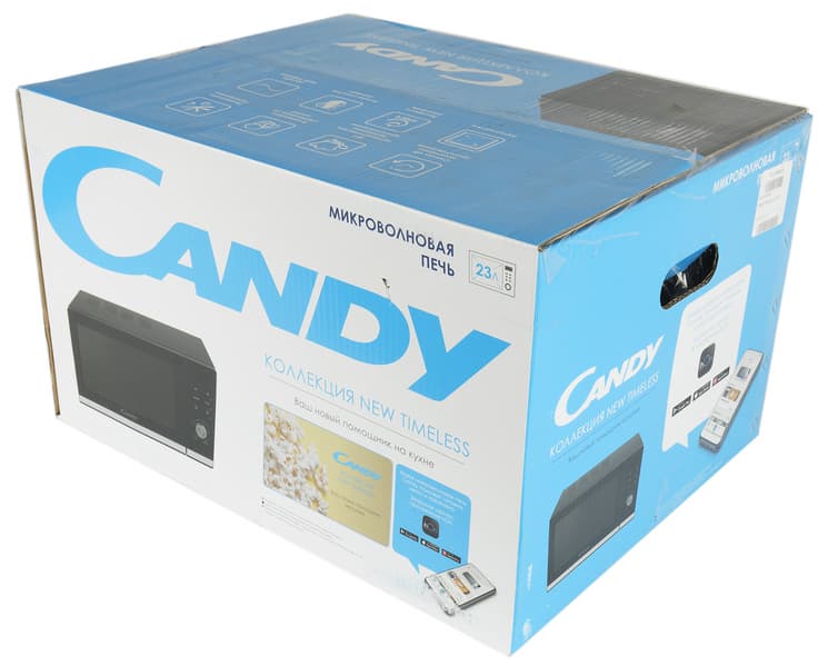 Печь поставляется в коробке, изготовленной из плотного гофрированного картона. Оформлена упаковка в белом и голубом цвете. На фронтальных сторонах размещена небольшая фотография прибора, название бренда и информация о фирменном приложении Candy. Ознакомившись с пиктограммами и подписями к ним наверху коробки, можно узнать об особенностях, а изучив боковые стороны, и о технических характеристиках микроволновой печи Candy CMWA23TNDB-07. На боковых сторонах упаковки имеются специальные отверстия для рук, что существенно облегчает переноску изделия.