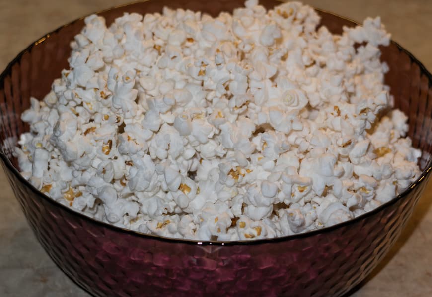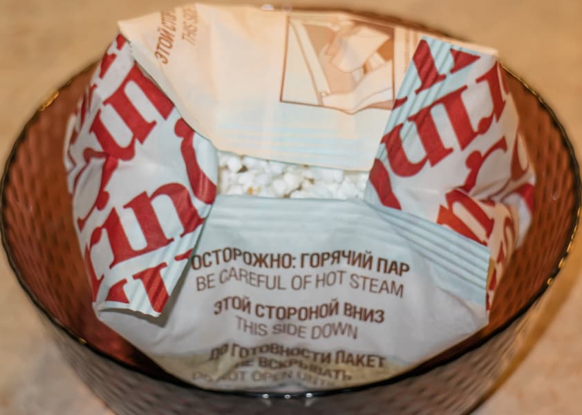 Открыли пакет, высыпали в огромную чашку. Попкорн получился белоснежный, без единого подгоревшего зернышка, идеально приготовленный.