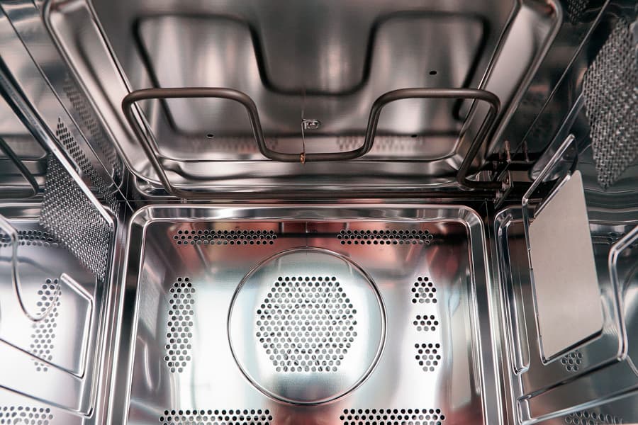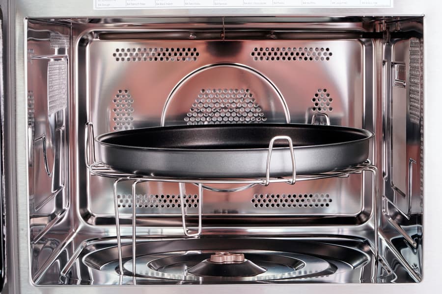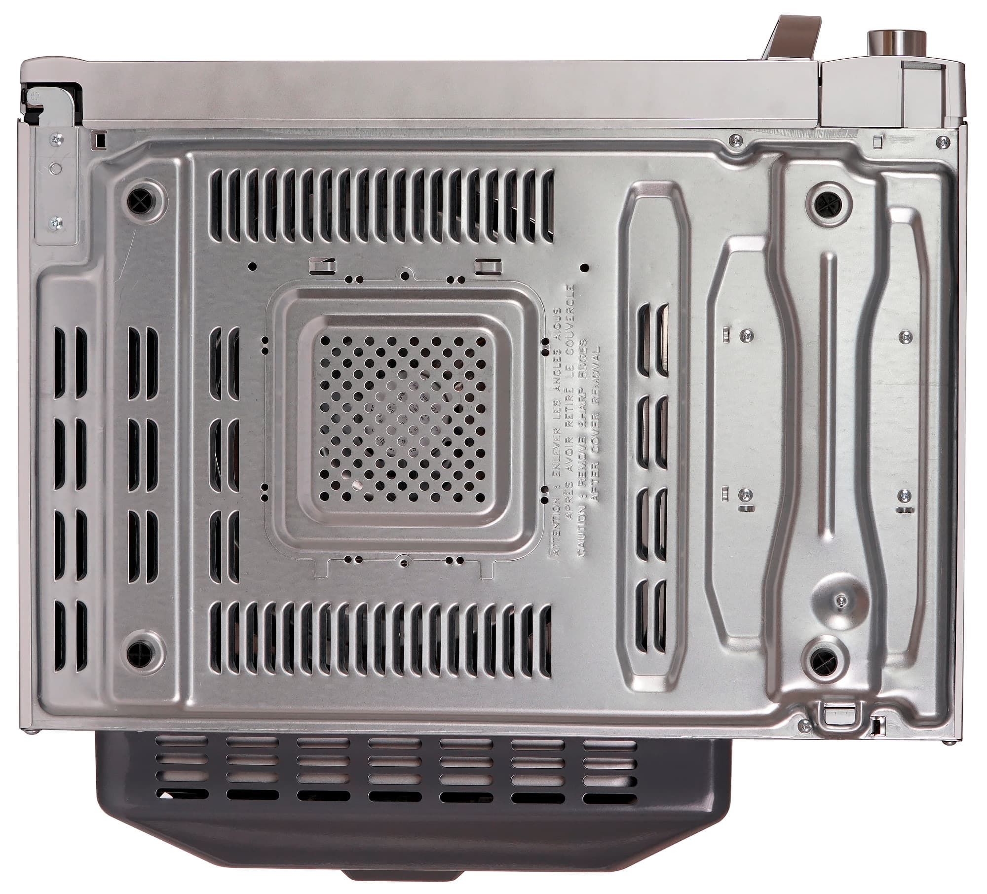 Вполне ожидаемым оказался и внутренний вид камеры: она представляет собой металлическую коробку с множеством отверстий. Сверху можно увидеть нагревательный элемент гриля, снизу — место для установки поворотного столика и стеклянной подставки.