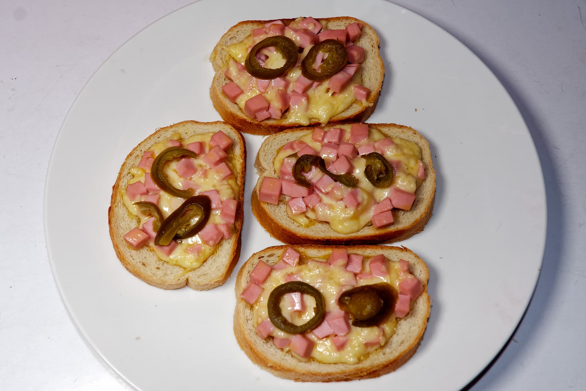 Нарезаем все ингредиенты, вбиваем яйцо, солим, перемешиваем, выкладываем на хлеб и готовим в режиме гриля или конвекции.