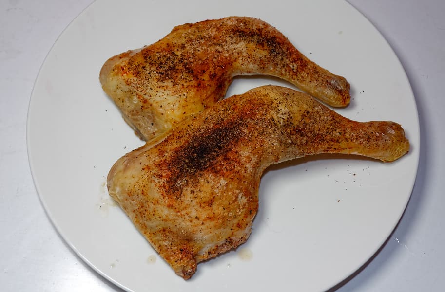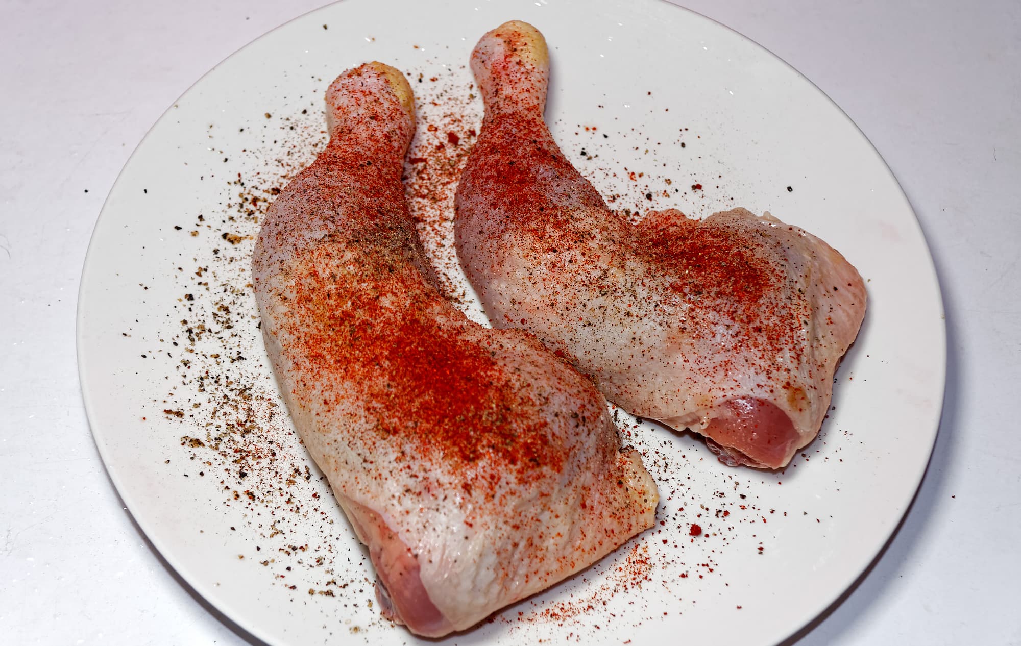 Мы взяли два куриных бедра, посыпали их солью и специями и поставили 20 минут на режим микроволны+гриль+конвекция.