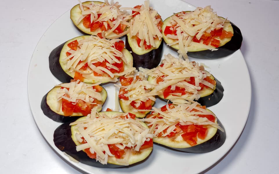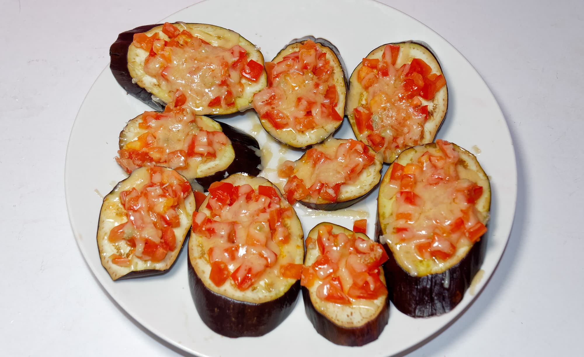Слегка приготовленные кусочки баклажана перевернули на другую сторону, а сверху на них положили измельченный чеснок, помидоры и сыр. Затем включили режим гриль+микроволны на 7 минут.