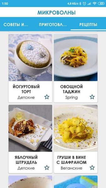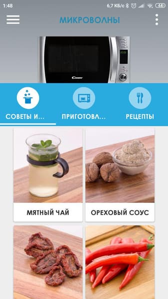 Само приложение (применительно к данной модели микроволновки) представляет собой набор советов и рецептов, которых мы насчитали более ста штук. Дистанционного управления, как мы уже упоминали, в нашем случае не предусмотрено, а следовательно — приложение выполняет исключительно роль «компаньона», к которому можно обратиться в случае, если возникли какие-то вопросы, либо просто в поиске вдохновения и нового рецептика.