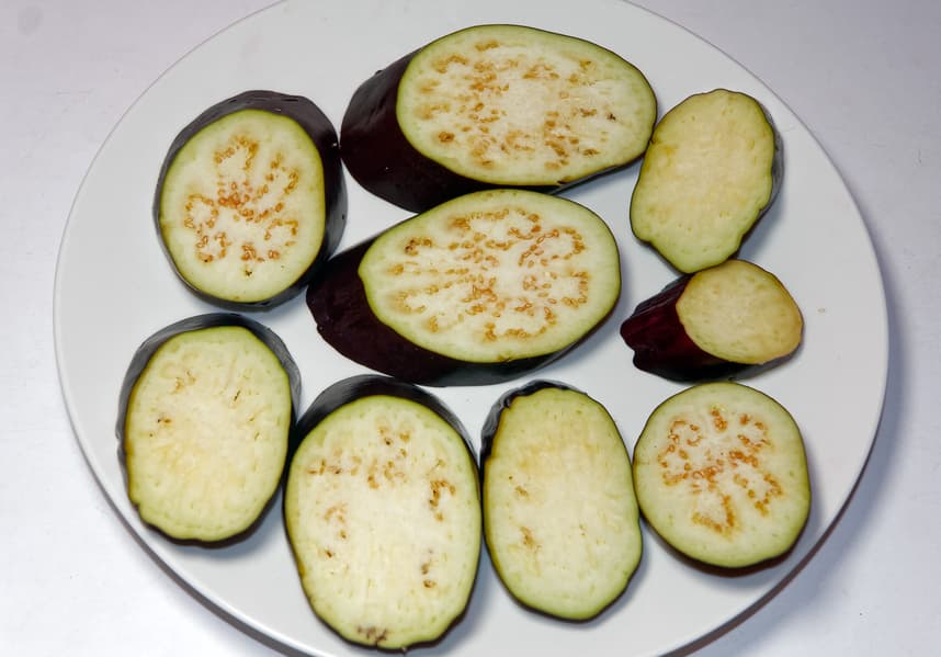 Мы нарезали кружочками небольшой баклажан и поставили на пару минут в режим микроволн+гриль. Кружочки немного потеряли упругость и подсушились сверху.