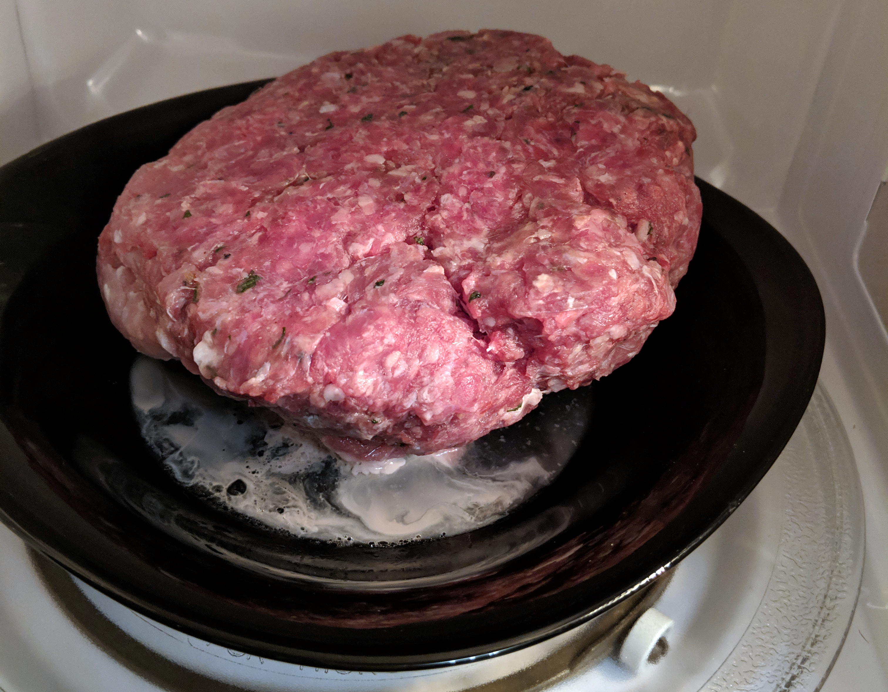 Микроволновка посчитала, что для такого куска нужно 20 минут 20 секунд. Мы нажали кнопку «+30» и решили заглянуть в камеру через пять минут. Однако отвлеклись и опоздали на две минуты. Это было не очень правильно, так как за это время фарш не только разморозился снаружи, но и немного коагулировал от нагревшейся тарелки. Площадь коагуляции была невелика, пара квадратных сантиметров, а толщина «припека» составила миллиметр. На тарелке появилась жидкость, натекшая из остатков инея на фарше.