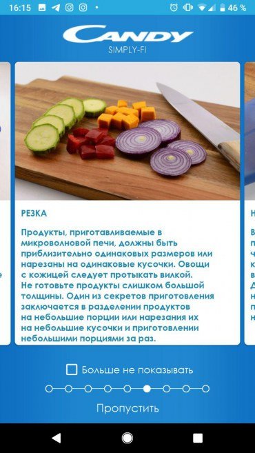 Компания Candy очень любит приложение Simply-Fi, и, разумеется, к этой микроволновке оно тоже подходит. Управлять приготовлением пищи с приложения не получается, так как печь не оснащена технологией Candy Wi-Fi. Но в нем есть полезные советы, рецепты для приготовления пищи именно в этой модели и некоторые выдержки из инструкции по эксплуатации.