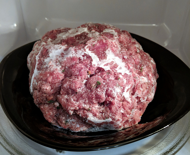 Для тестирования разморозки в СВЧ у нас есть обязательная программа: мы берем хорошо замороженный фарш в равных долях состоящий из свинины и говядины, и размораживаем его в режиме «по весу» — 800 граммов.