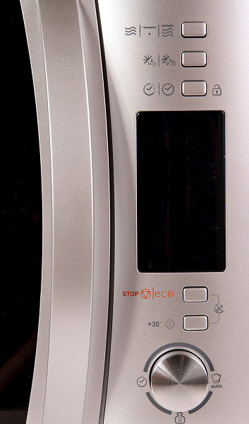 Кнопка «Отмена» включает в себя не только прекращение всякой деятельности СВЧ-печи, но и функцию «Эко» (экономия ресурсов, в том числе отключение подсветки внутри печи), а также очень полезный переход в беззвучный режим. Для того, чтобы микроволновка больше не издавала сигналов, надо вместе с ней удерживать в течение 3 секунд кнопку «+30».