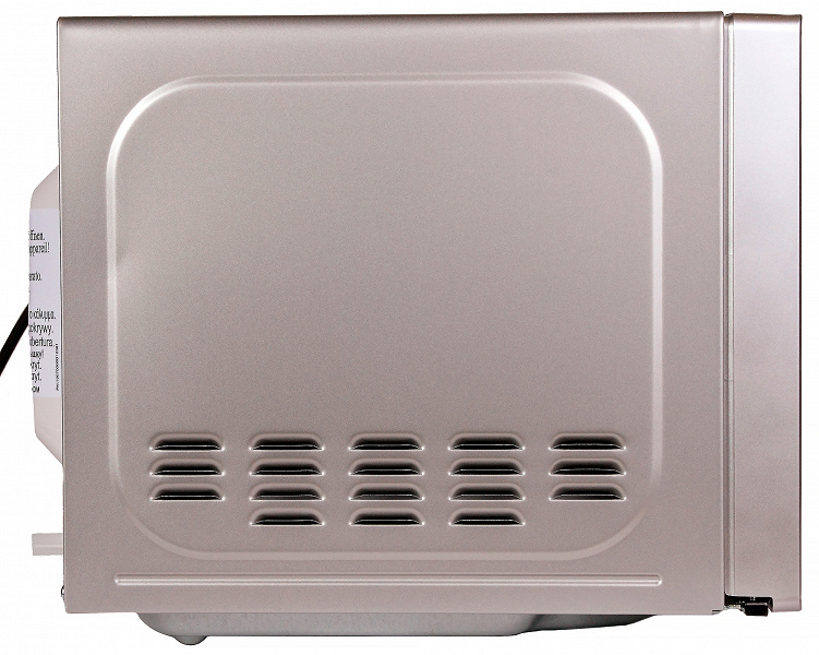 На левой и задней частях корпуса мы увидели вентиляционные отверстия. Сзади также есть ограничители, которые не позволят установить прибор вплотную к стене. В инструкции написано, что их величины вполне достаточно, чтобы предотвратить нагревание той поверхности, которая окажется за микроволновкой.