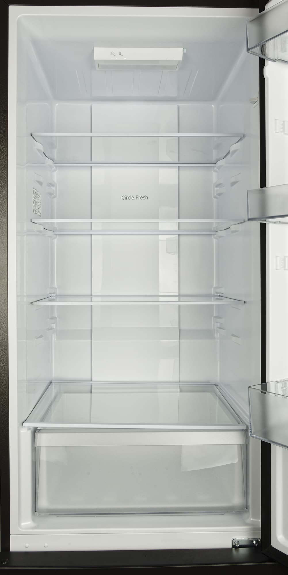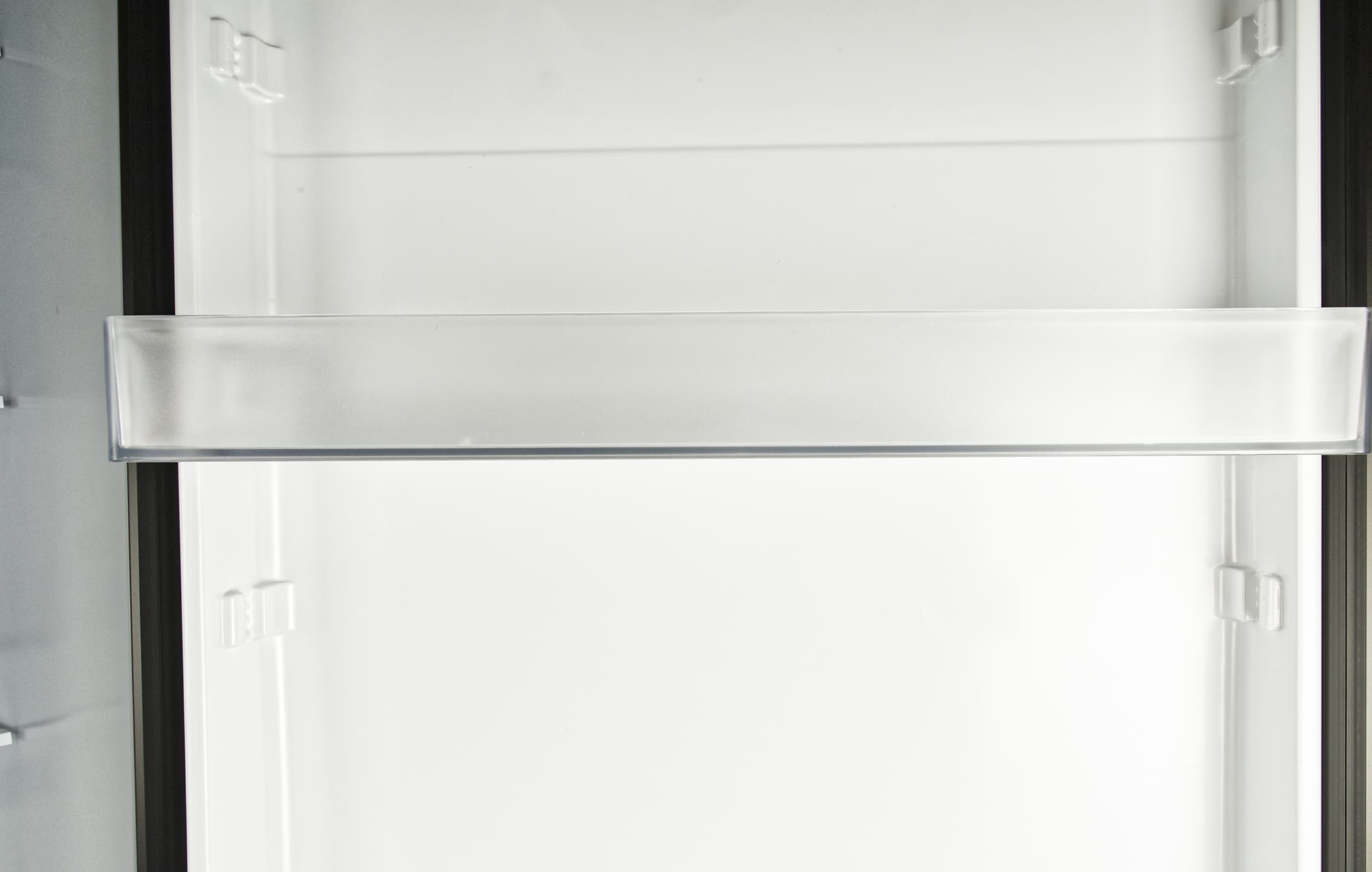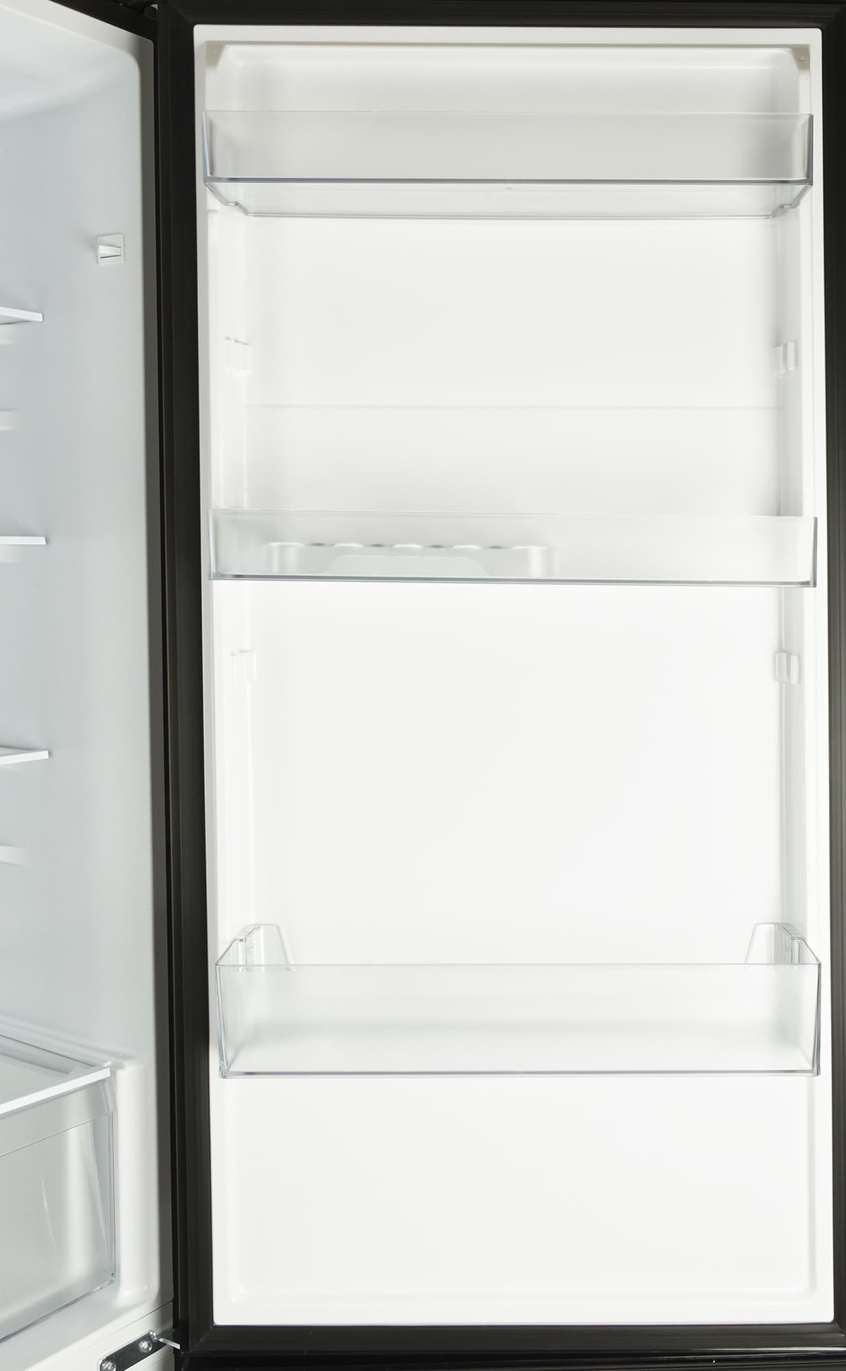 На дверце холодильника — три полки из прозрачного пластика.