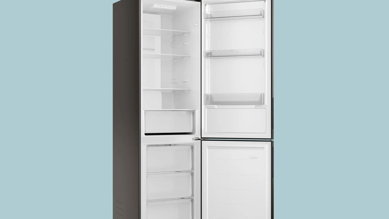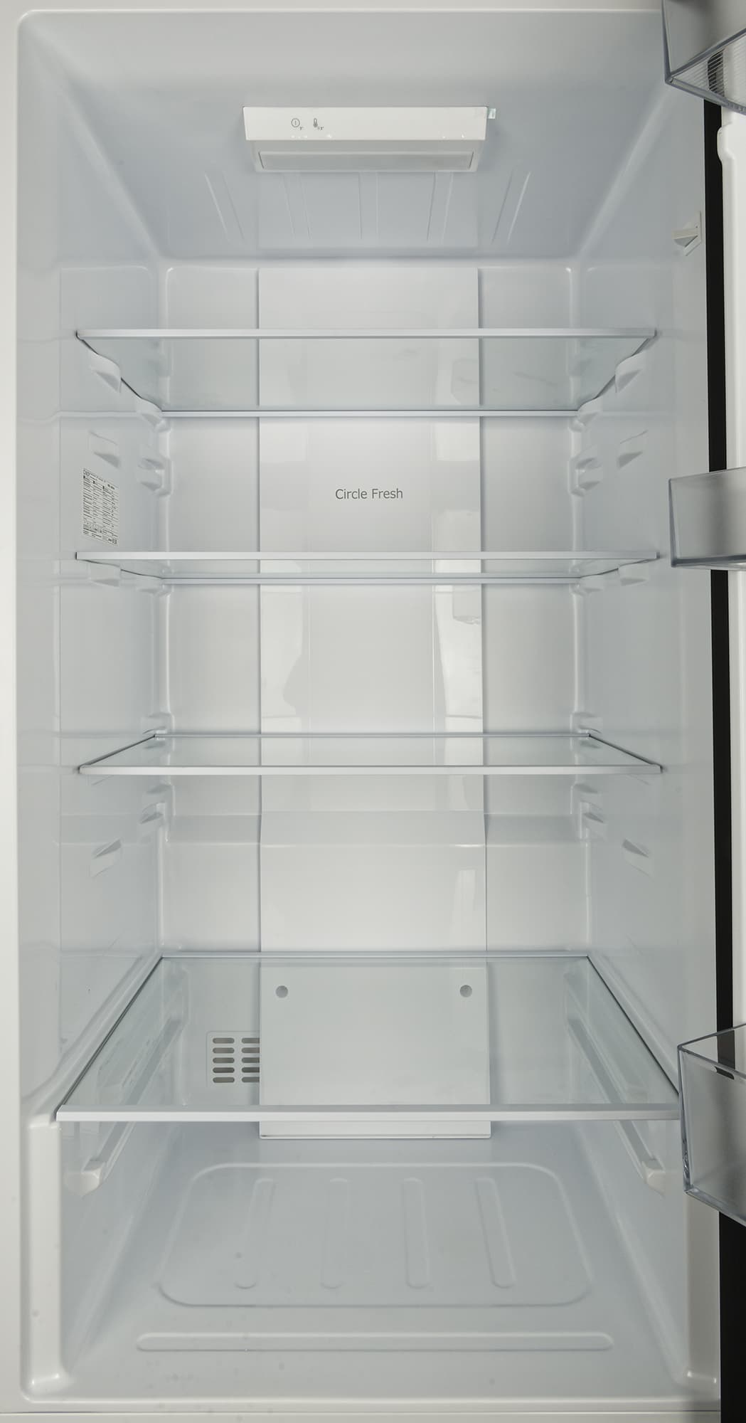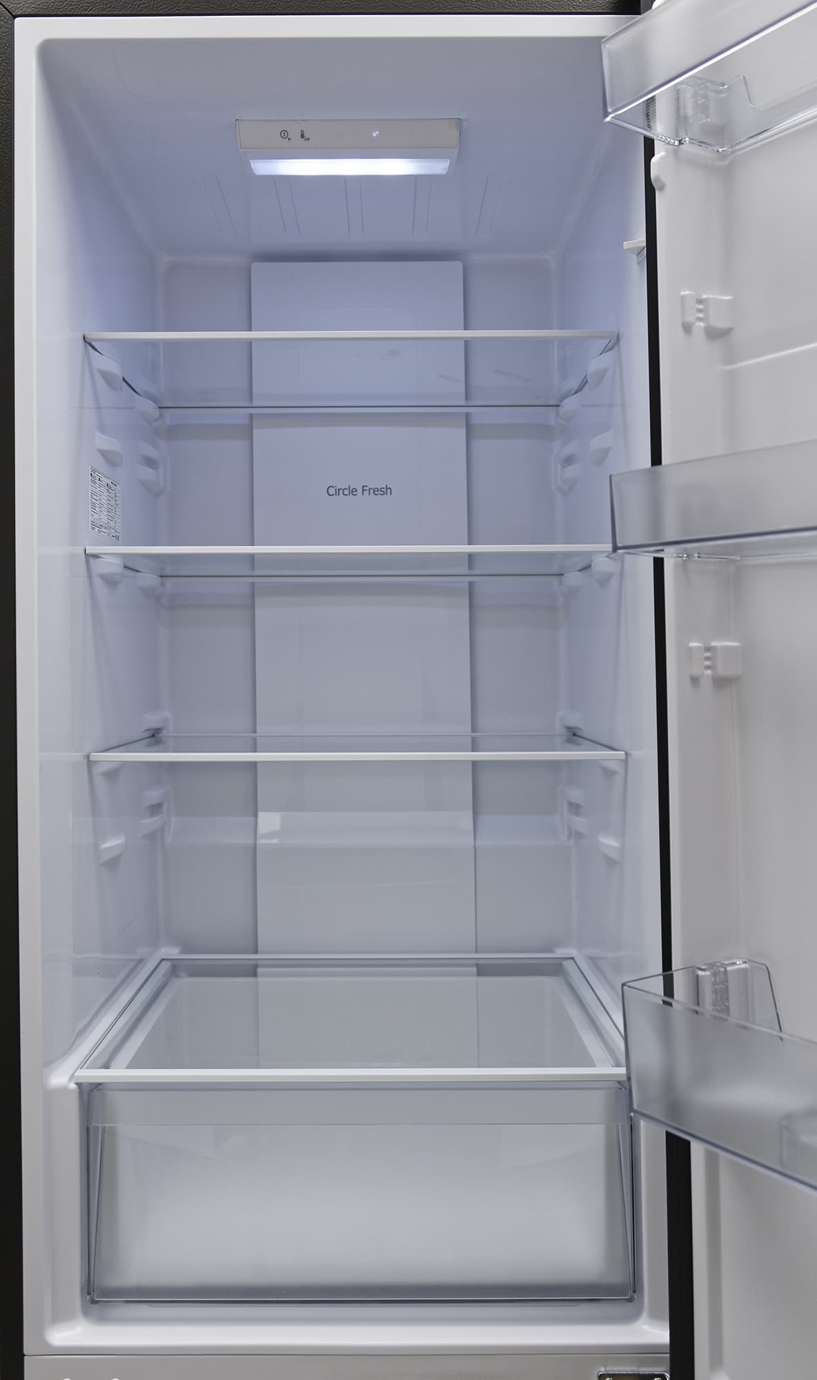 На дверце холодильника — три полки из прозрачного пластика.