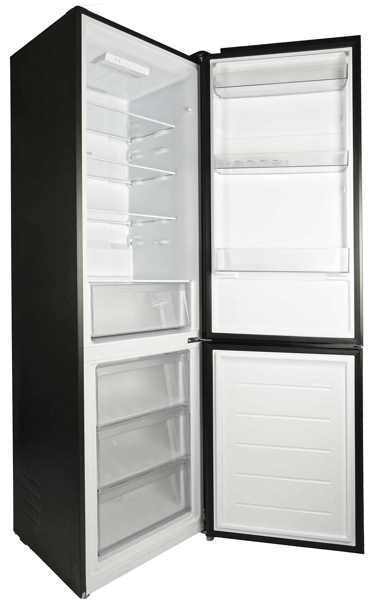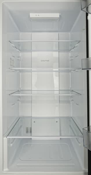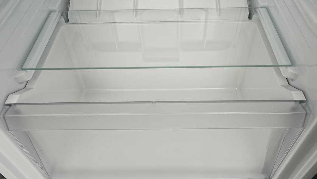 Внутри холодильного отделения — три полки из закаленного стекла. Четвертая, нижняя, является одновременно и крышкой ящика для овощей и фруктов.