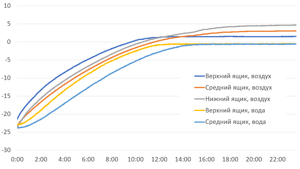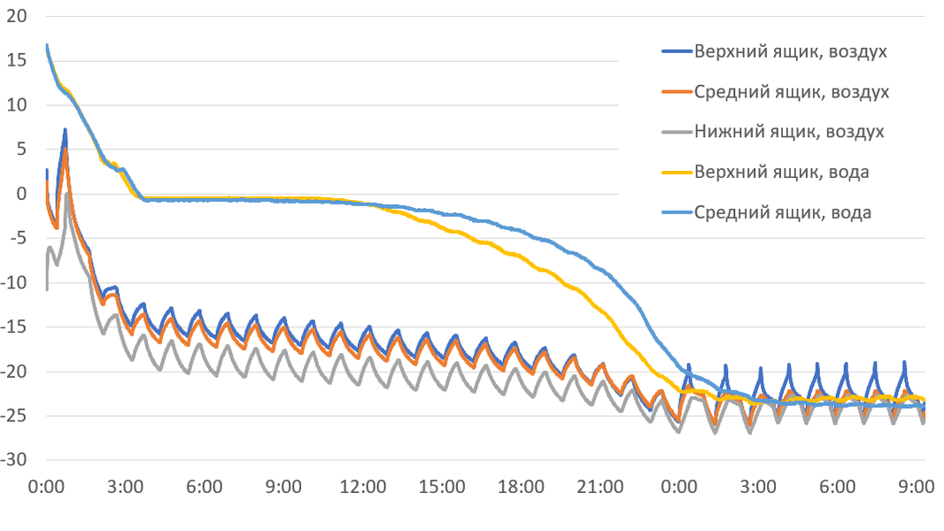Чтобы оценить замораживающую способность холодильника, мы поместили контейнеры с водой комнатной температуры в средний и нижний ящики морозильной камеры и включили режим максимального охлаждения. Результаты измерений температуры воды и воздуха можно видеть на графике ниже.