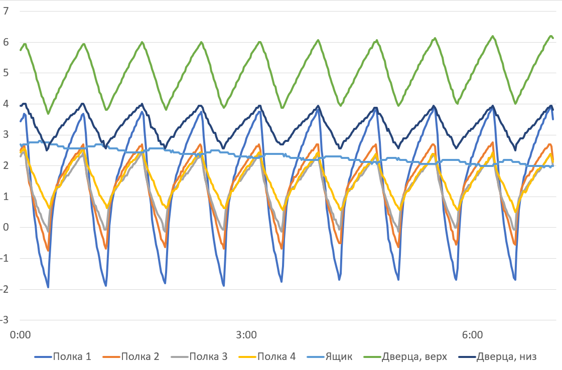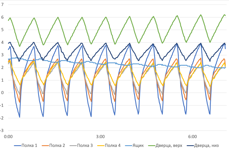 Считаем необходимым еще раз подчеркнуть, что приведенные графики иллюстрируют не потребительские качества холодильника, а особенности логики работы холодильного агрегата и циркуляции холодного воздуха между зонами камеры. Не следует удивляться таким, на первый взгляд, существенным колебаниям: охлажденные продукты обладают значительно большей тепловой инерцией, нежели воздух в камере, и переносят циклические изменения температуры нормально.