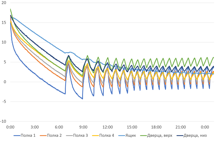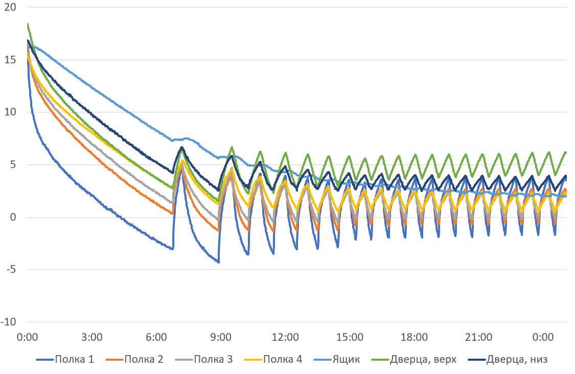Как известно температура внутри холодильной камеры зависит не только от установленной мощности охлаждения, но и от расположения охлаждаемого продукта. Мы включили холодильник с балластом в режиме максимальной мощности и проследили за изменениями температуры в камере в течение суток (здесь и далее нумерация полок производится сверху вниз). Результаты измерений можно видеть на графике.
