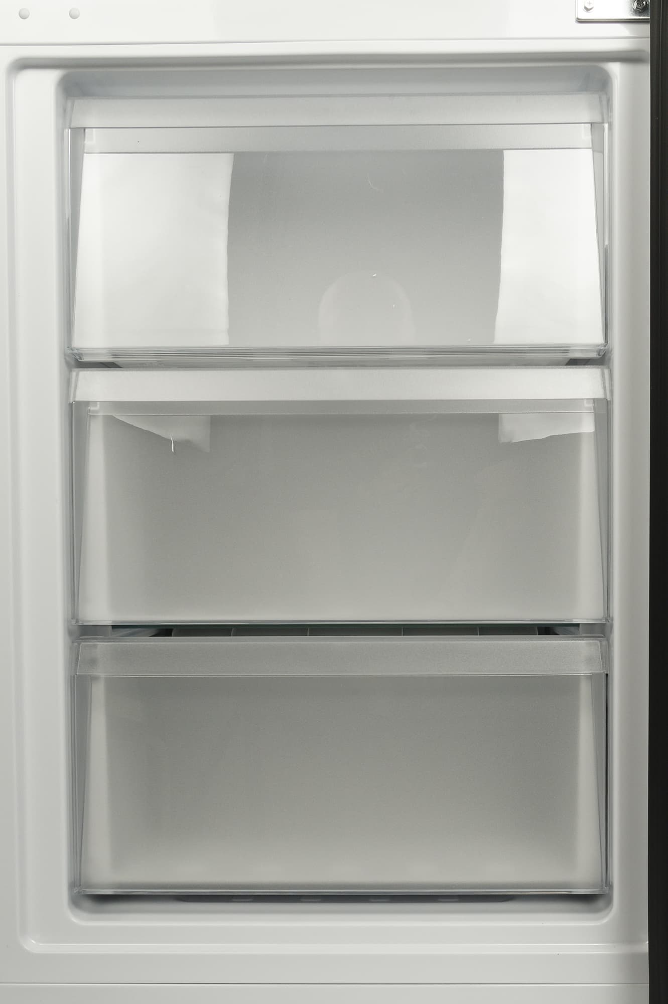 Внутри морозильной камеры — три ящика равной высоты. Объем двух верхних одинаков, а нижний, за которым на задней стенке располагается ниша компрессорного отсека — заметно короче.