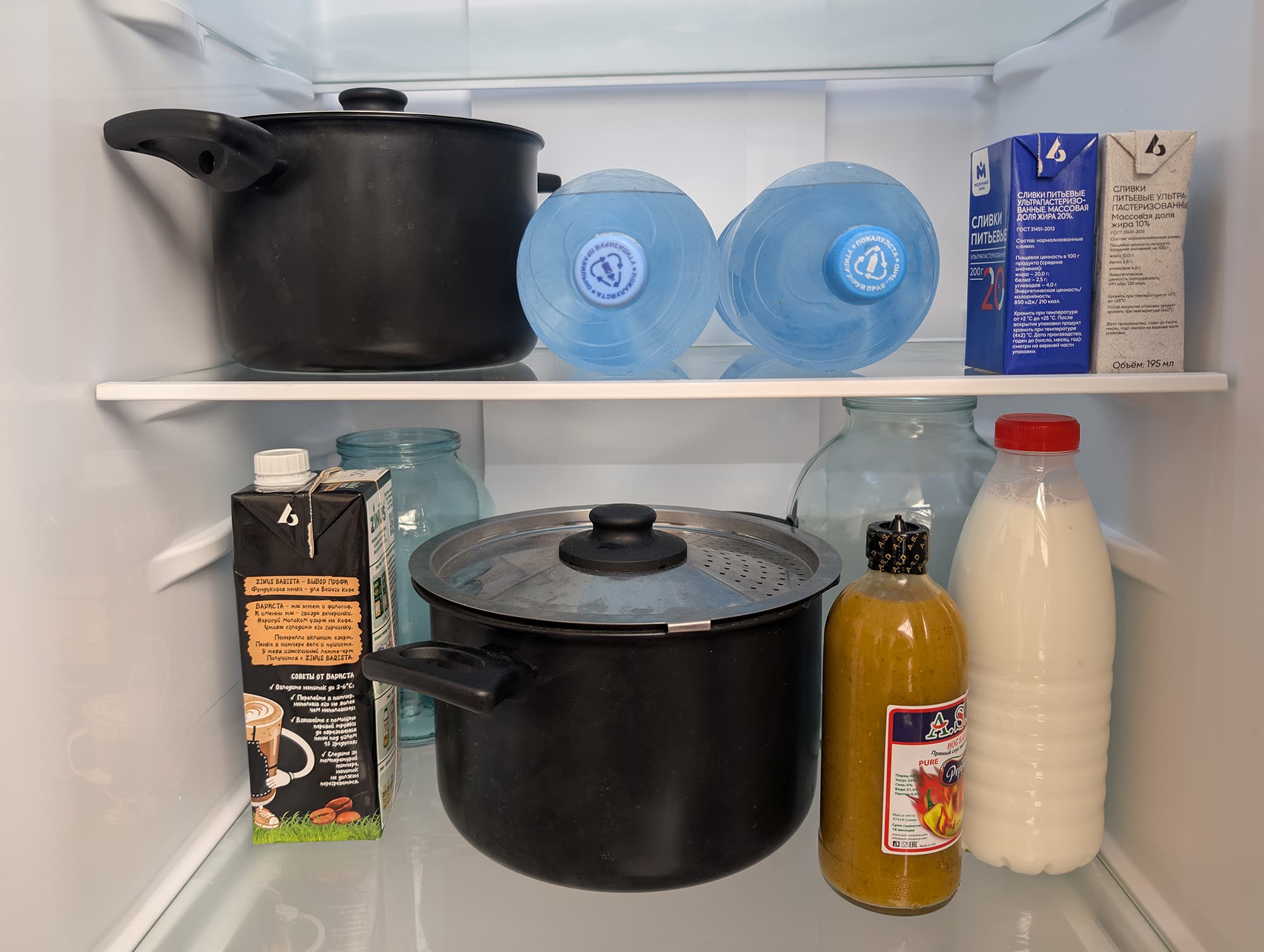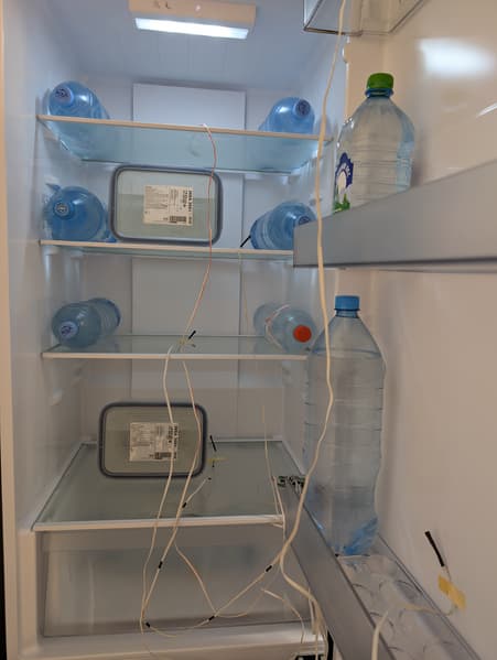 Чтобы имитировать работу загруженного холодильника, в процессе тестирования холодильной камеры мы использовали водяной балласт в таких же четырехлитровых контейнерах, как и при испытании морозилки. Кроме того, на полки и дверцу холодильника положили несколько пластиковых бутылок с водой.