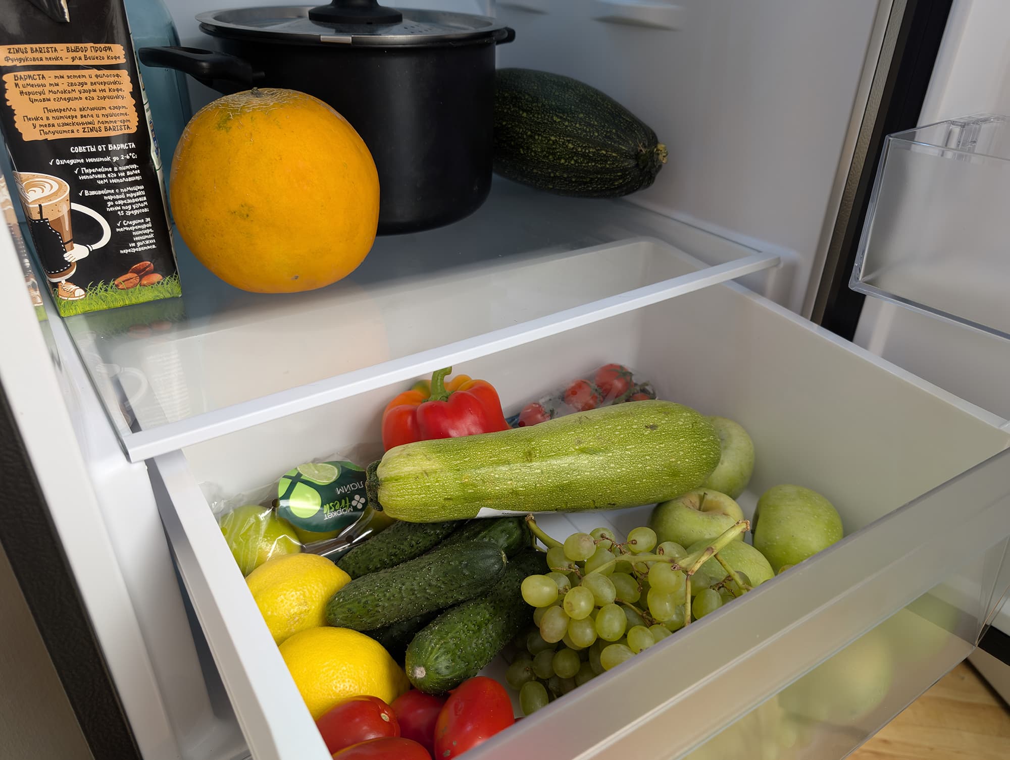 Емкость ящика зоны свежести достаточна для хранения большого объема овощей и фруктов. К сожалению, никаких перегородок или органайзеров здесь не предусмотрено: об аккуратности размещения продуктов пользователю придется заботиться самостоятельно.