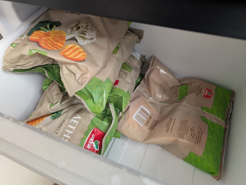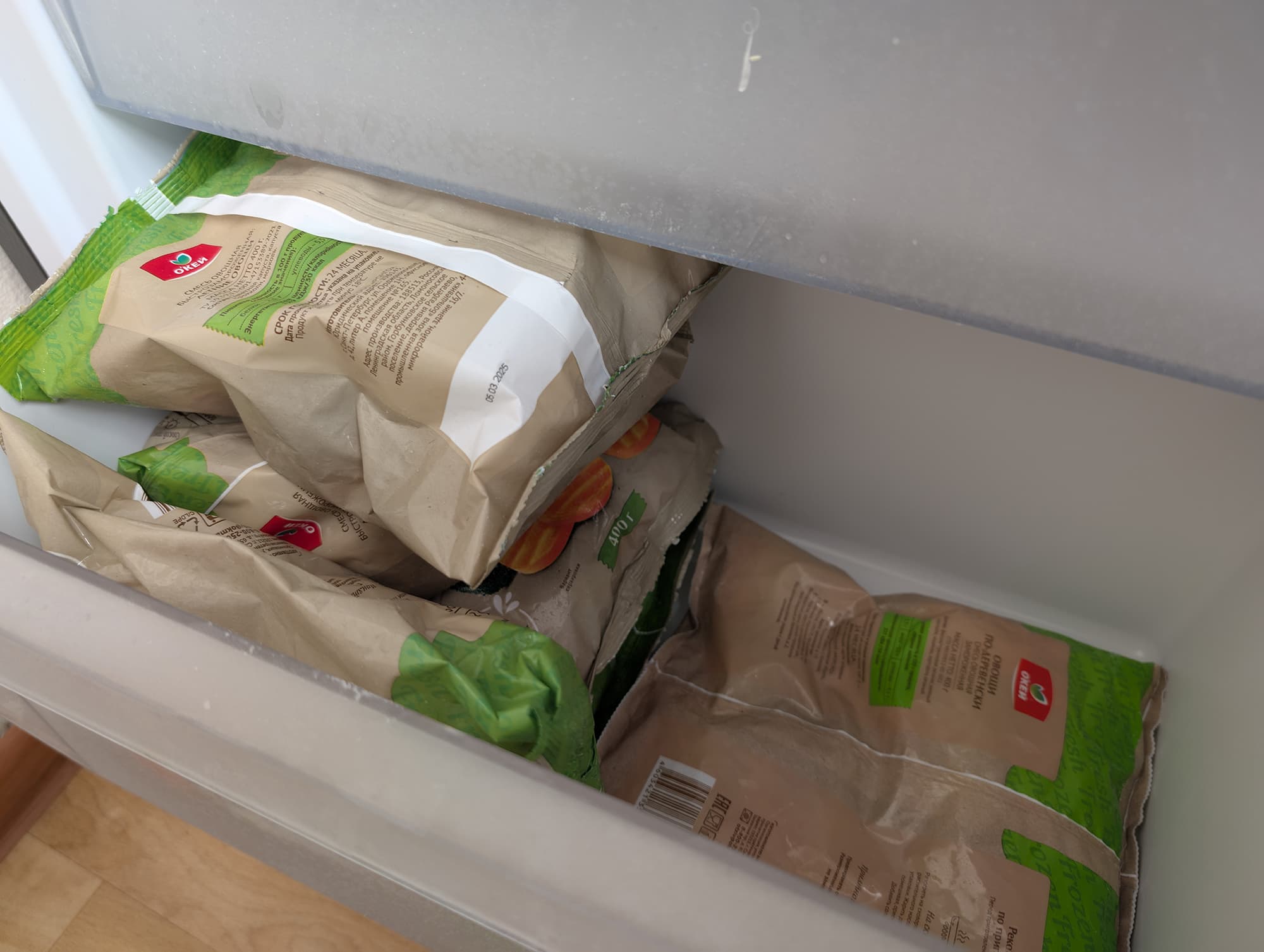 Для наглядной оценки вместимости морозильного отделения мы, по традиции, используем стандартные 400-граммовые пакеты с замороженными овощами. Габариты двух верхних ящиков позволяют разместить в них четыре стопки упаковок — по четыре-пять штук в каждой.