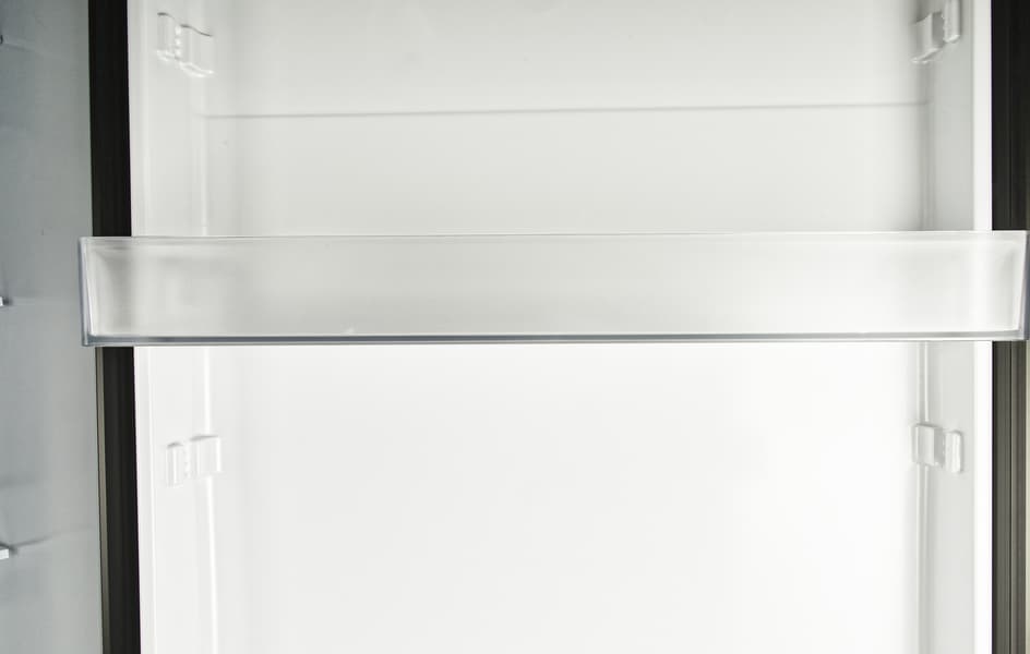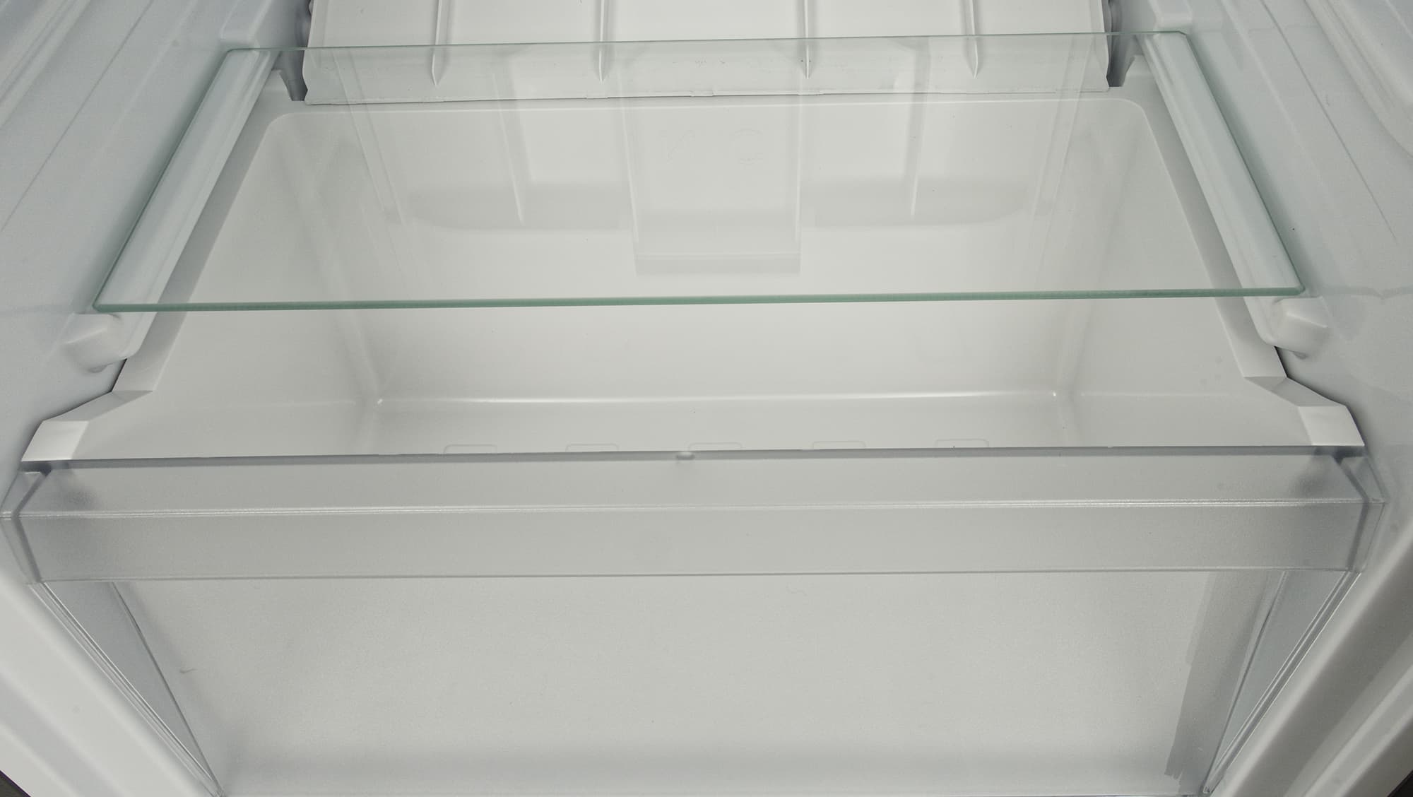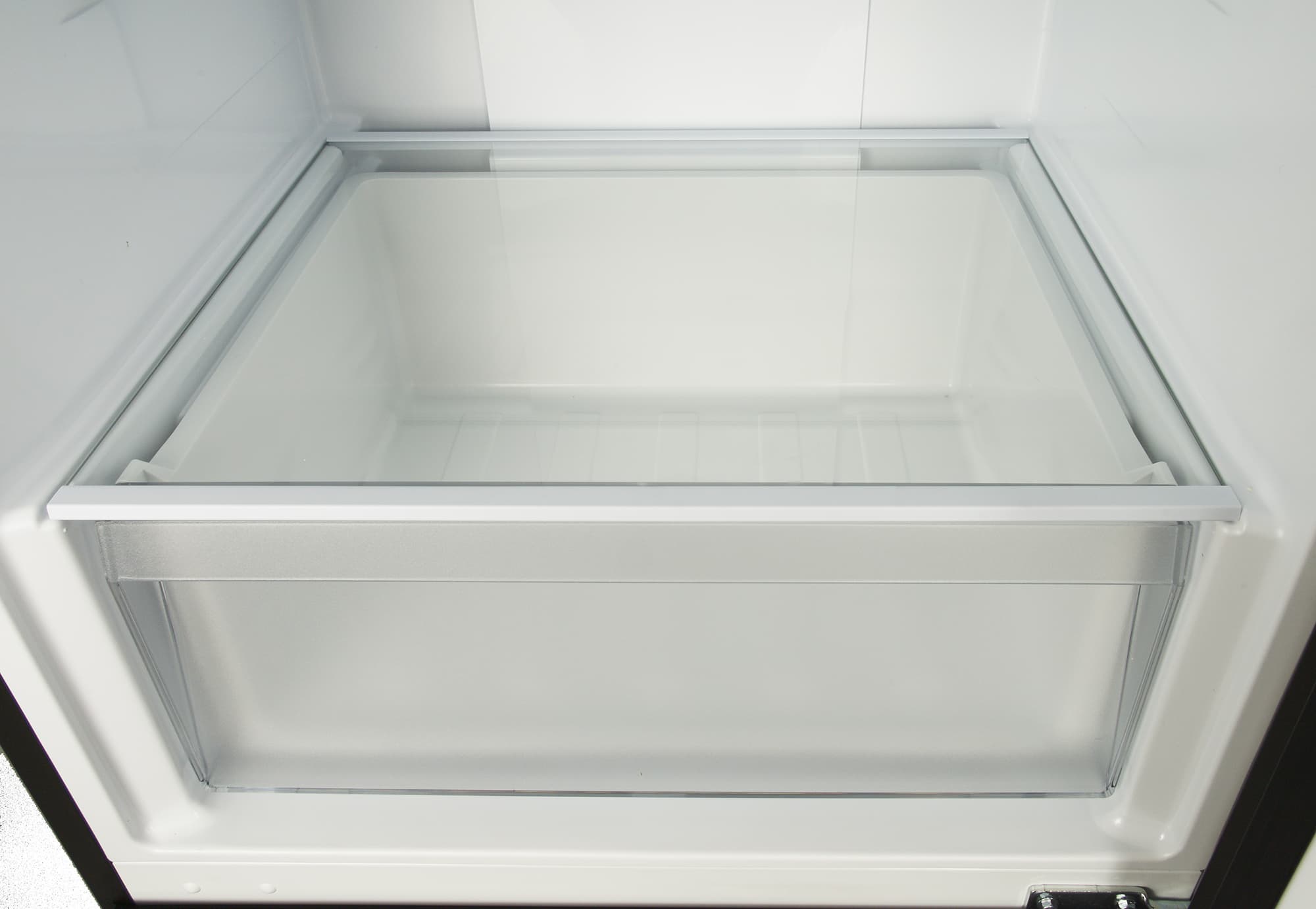 У ящика для овощей и фруктов вполне традиционная конструкция: прозрачная передняя стенка позволяет видеть содержимое, а дно и три других стенки выполнены из белого пластика. Контейнер не оборудован разделителями и органайзерами.