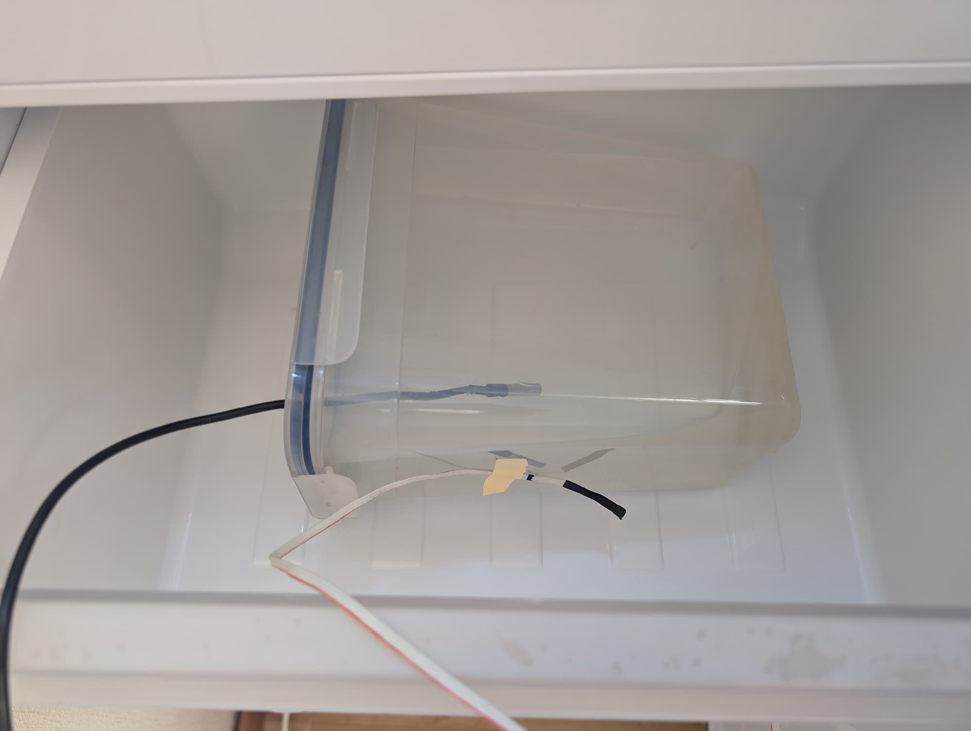 Помимо датчиков температуры воды использовались такие же, но для воздуха. Их мы поместили рядом с контейнерами в те же отсеки — так, чтобы поверхность сенсоров не контактировала напрямую с элементами корпуса морозильной камеры.
