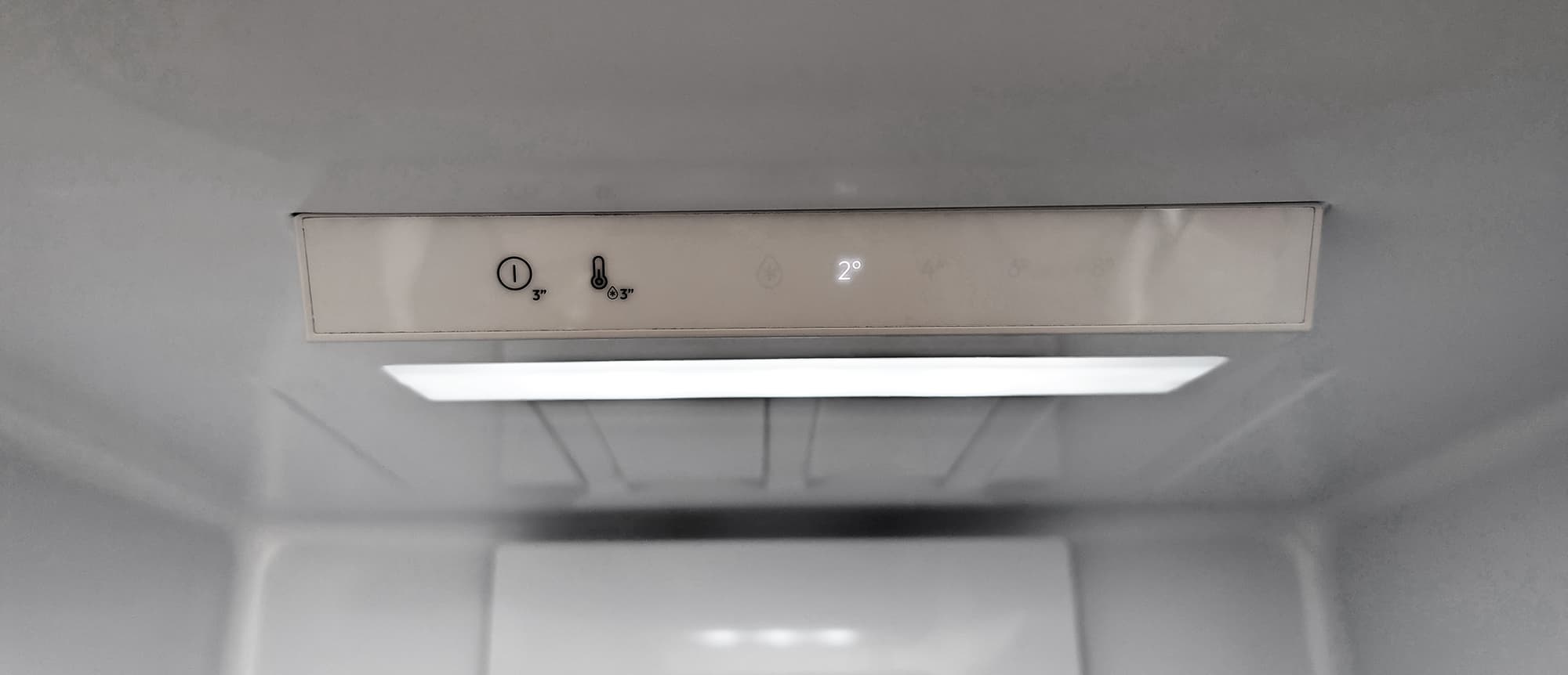 Управляющий модуль размещен на потолке холодильной камеры, он совмещен с блоком светодиодной подсветки.
