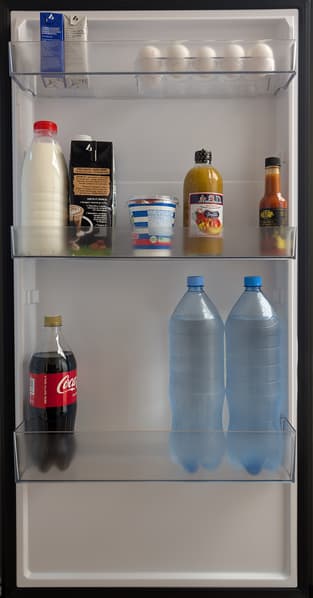 На нижней полке дверцы свободно размещаются стандартные емкости объемом до двух литров, на средней — бутылки и пакеты до литра. Среднюю и верхнюю полки при необходимости можно переместить ниже: тогда расстояние между ними будет примерно равным.