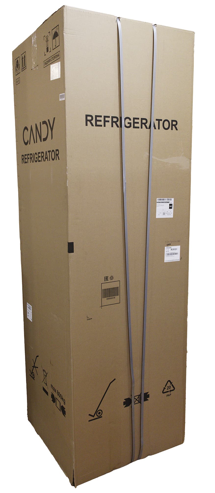 Холодильник приезжает к покупателю на поддоне из пенопласта, к которому капроновыми стропами притянута картонная упаковка.