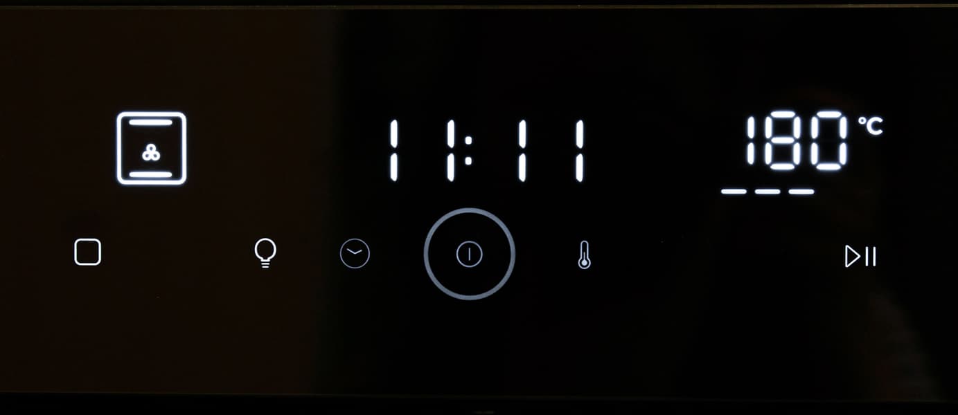 Блок управления духовкой состоит из дисплея и ряда кнопок под ним. Дисплей делится на три части: в левой отображается режим приготовления, посередине — время, по бокам от него — значки активированных функций таймера и блокировки, а в правой части выводится значение выбранной температуры. В момент нагрева под цифрой мигает и по мере достижения заданной температуры постепенно заполняется пунктирная линия.
