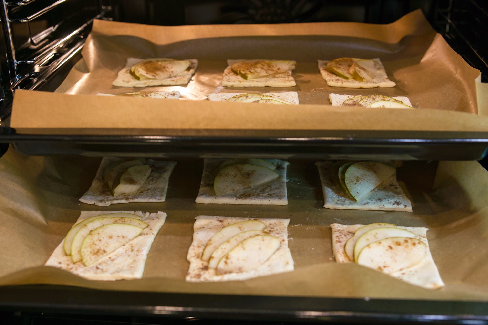 Разложили будущие слойки на два противня, предварительно застеленных бумагой, и отправили в духовку, разогретую до 180 °C.