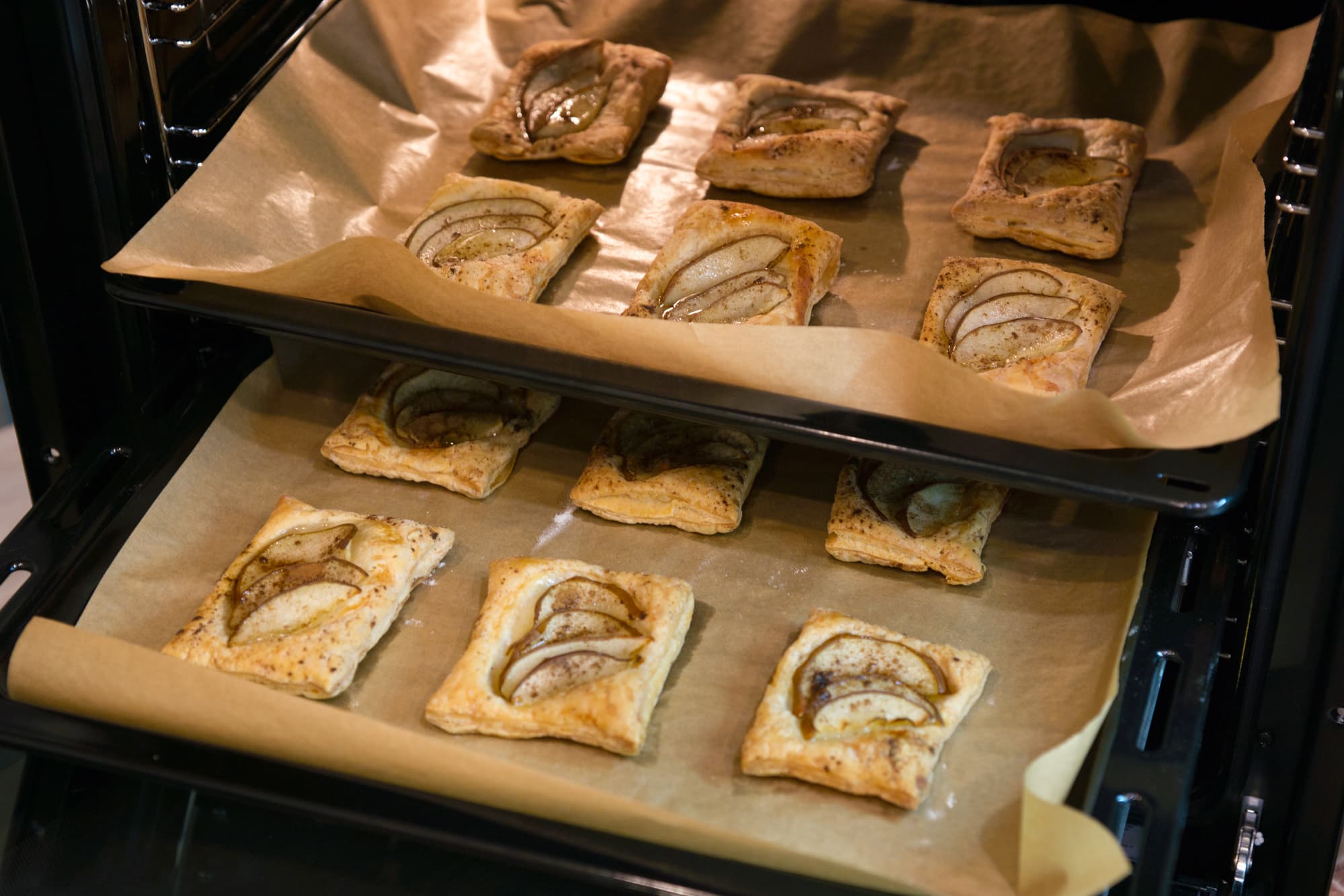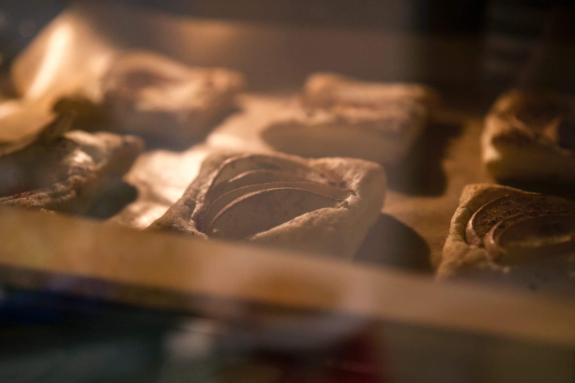 Первые 20 минут изделия выпекались в режиме верх + низ. За это время слойки заметно выросли в объеме, и уже стала видна их слоистая структура.