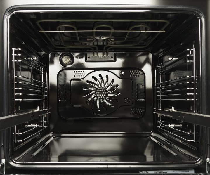 Сверху располагается тэн гриля, а по центру задней стенки — вентилятор конвекции. В левом верхнем углу находится лампа накаливания, освещающая камеру во время работы.
