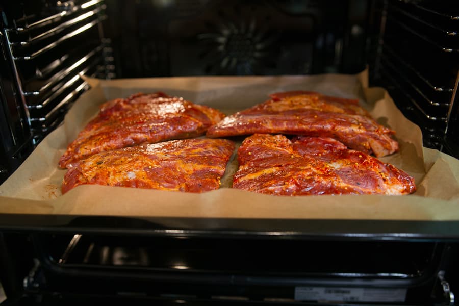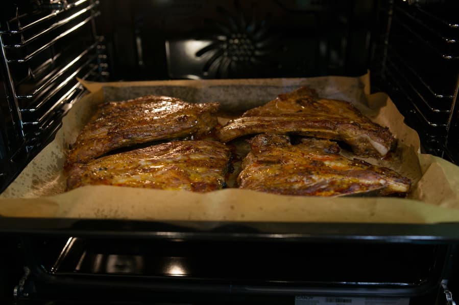 Следом в разогретую уже до 200 °C камеру отправились крупные свиные ребра, обмазанные специями и томатным соусом.