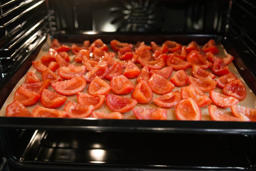 Для тестирования режима сушки в разогретую до 70 °C духовку был помещен противень с дольками томатов, лишенных плодоножек и семян. На один уровень поместилось 670 г.