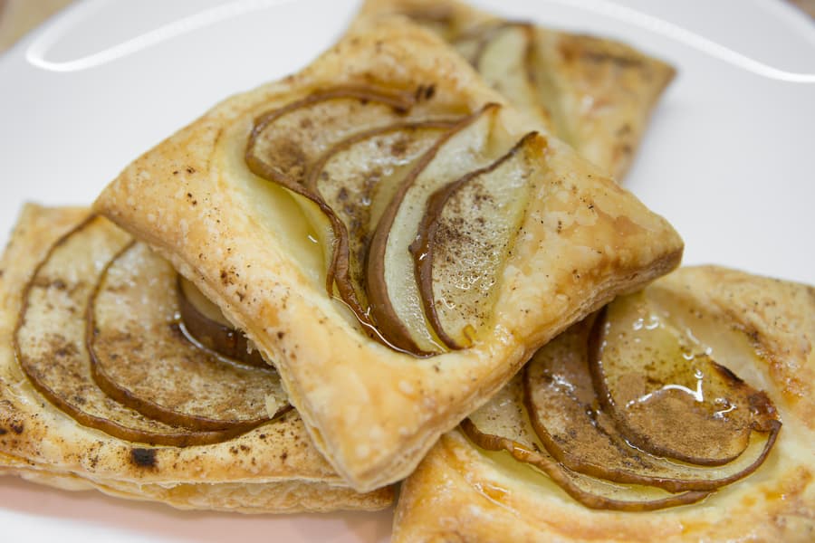 Пару пластов слоеного бездрожжевого теста, не раскатывая, нарезали на крупные прямоугольники. Выложили на каждый по несколько долек груши, присыпали корицей и мускатным орехом.