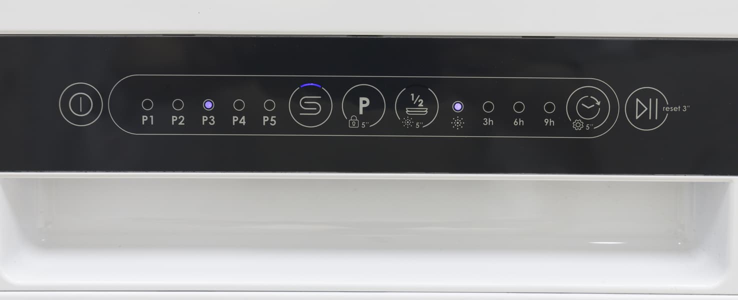 После нажатия на кнопку включения (первая слева) загорается дисплей и индикатор выбранного режима. Для выбора программы необходимо последовательно нажимать кнопку Р — при каждом нажатии будет загораться соответствующий индикатор, а на дисплее появится время работы установленного режима. Как только программа выбрана, жмем на кнопку Старт/Пауза (крайняя справа) и машина запускает цикл. При необходимости цикл можно прервать повторным нажатием кнопки запуска. Еще одно нажатие той же кнопки возобновляет программу. По завершении раздастся звуковой сигнал (если он не был отключен). Можно нажать крайнюю левую кнопку и выключить посудомойку. Если этого не сделать устройство автоматически перейдет в режим ожидания через 30 секунд.