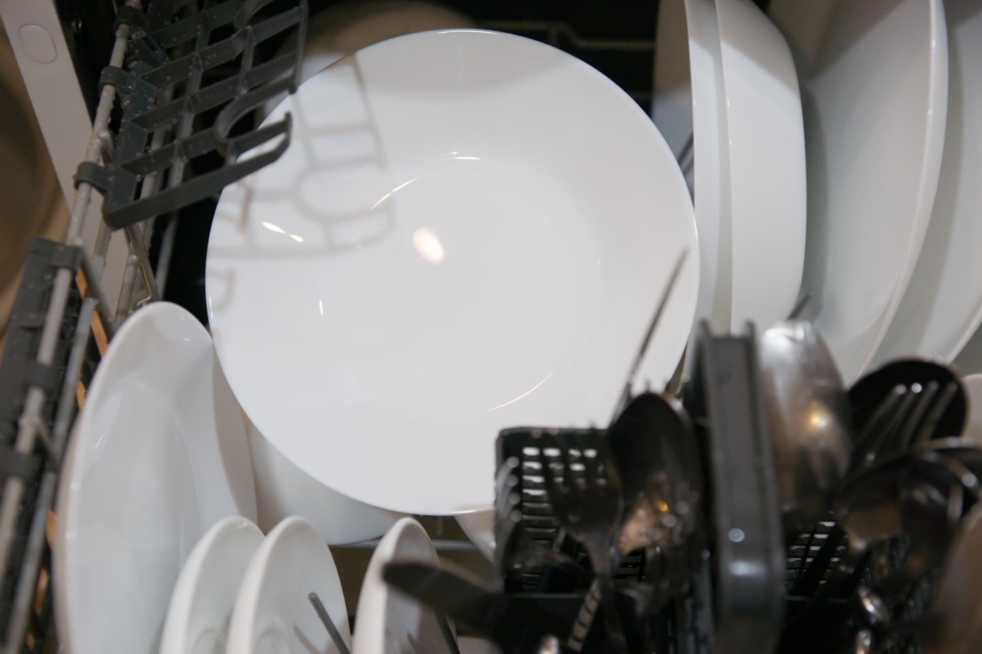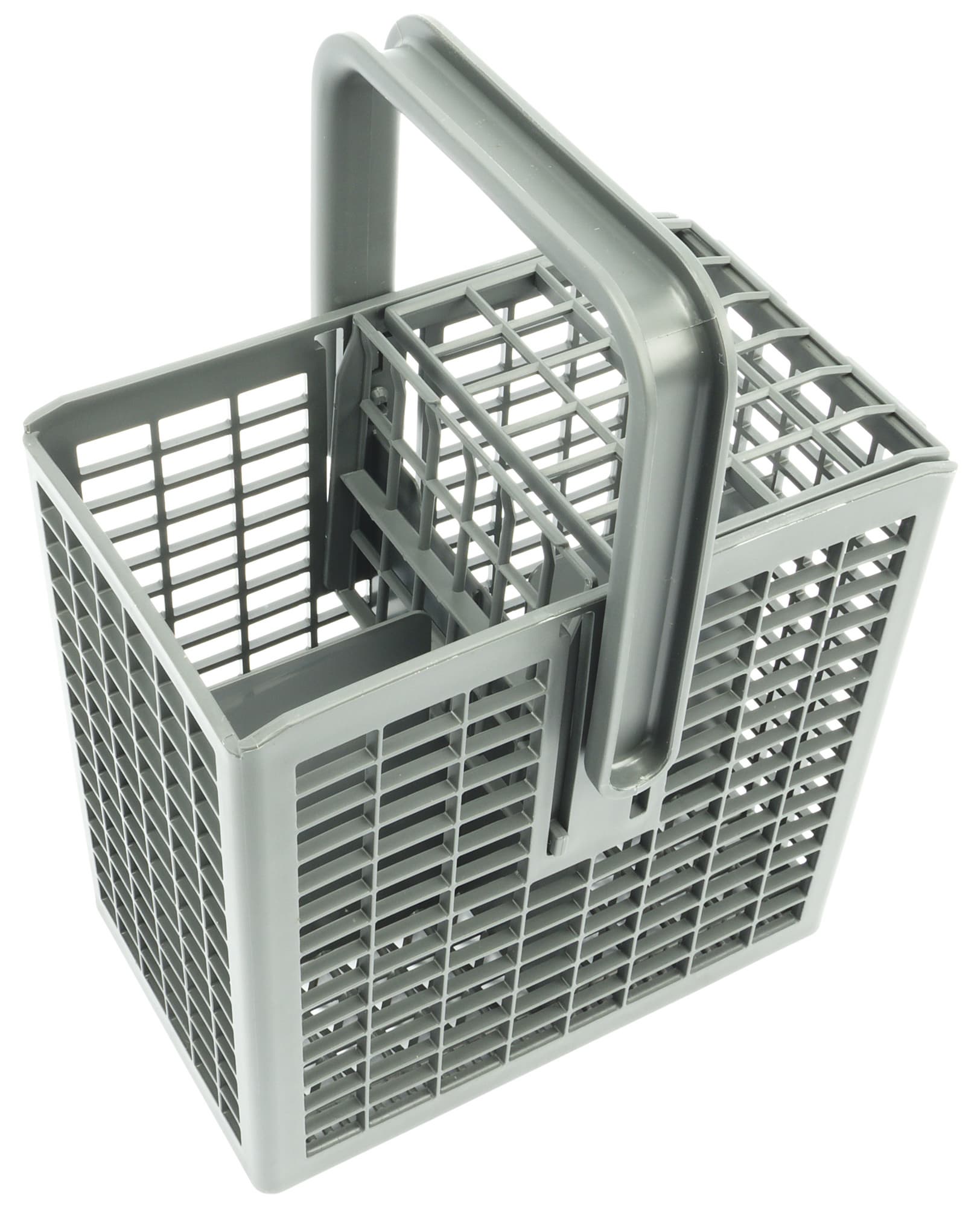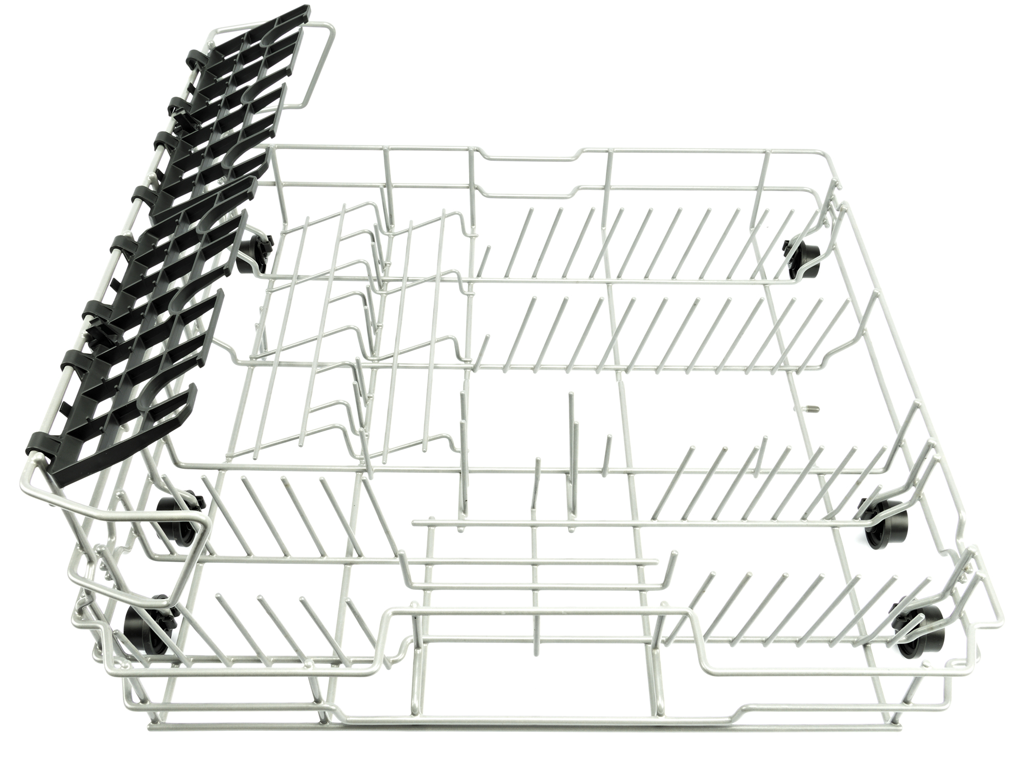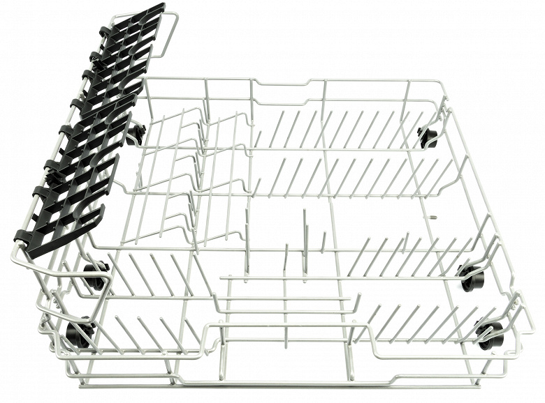 Правый дальний угол корзины предназначен для установки больших тарелок, левая дальняя зона — для стаканов, чашек и пиал. В левой ближней части корзины можно разместить блюдца, в правой — небольшие тарелки, а между ними встает пластиковая корзинка для приборов.