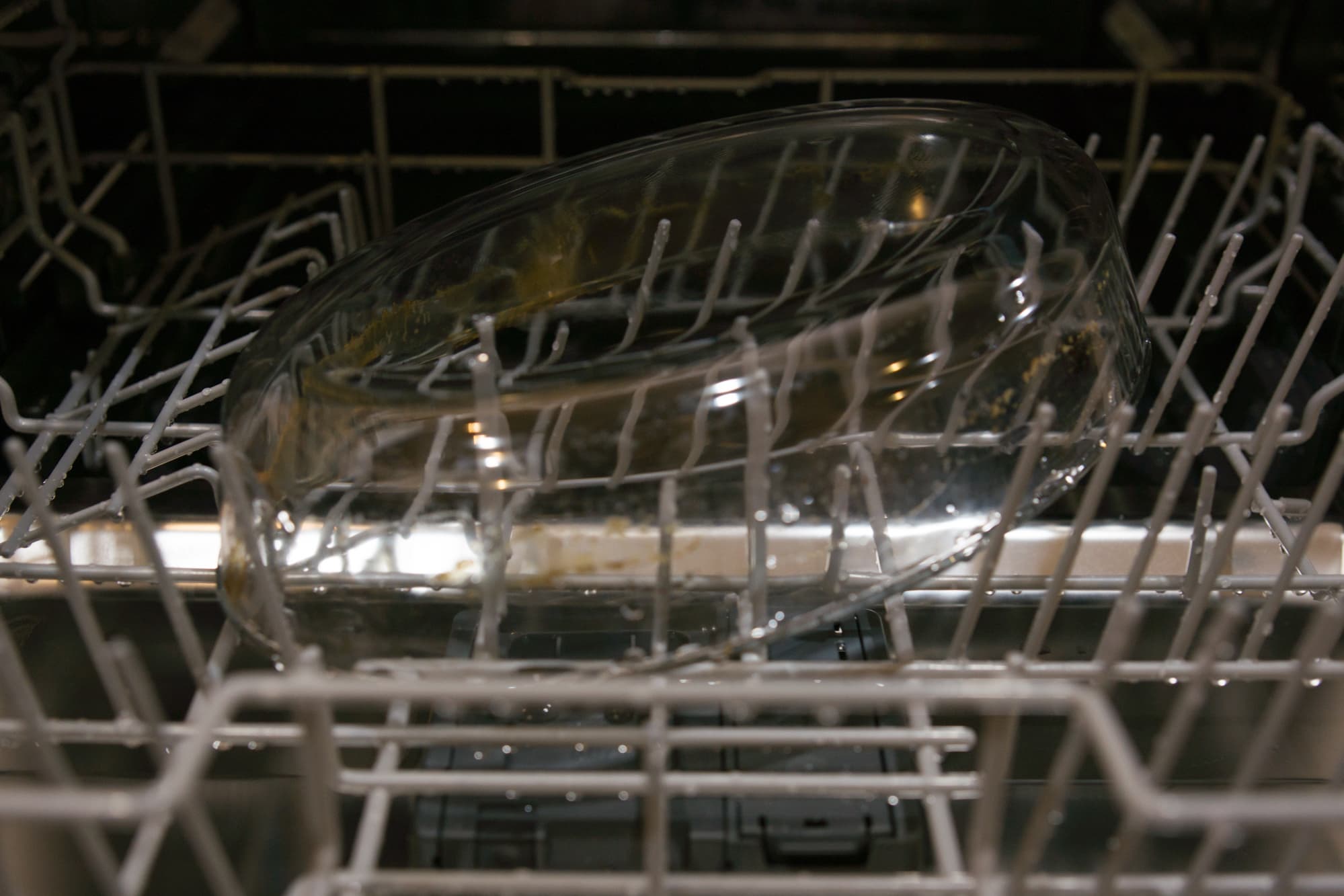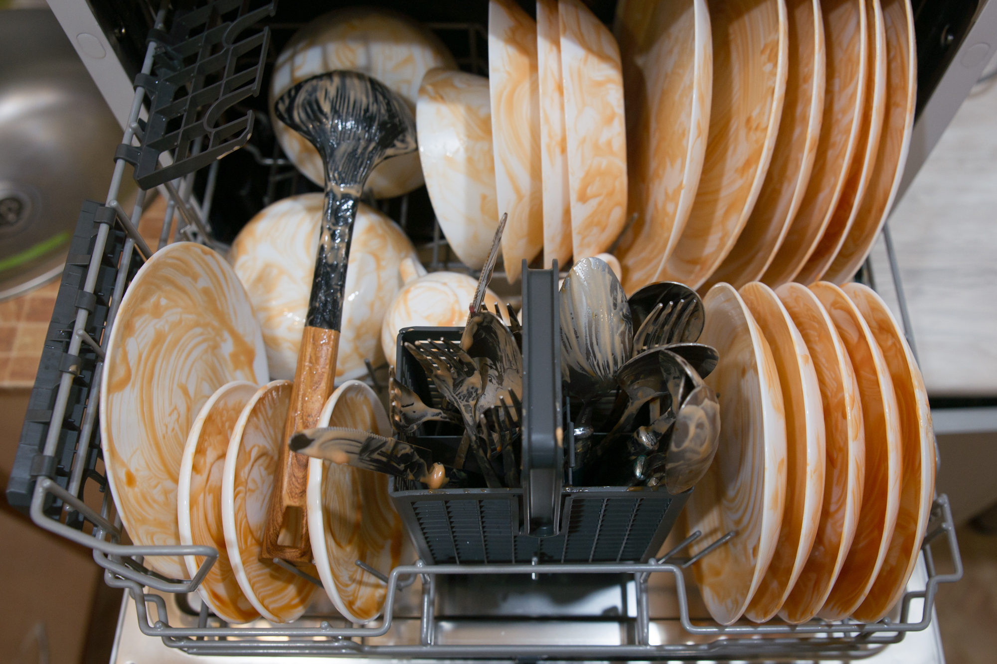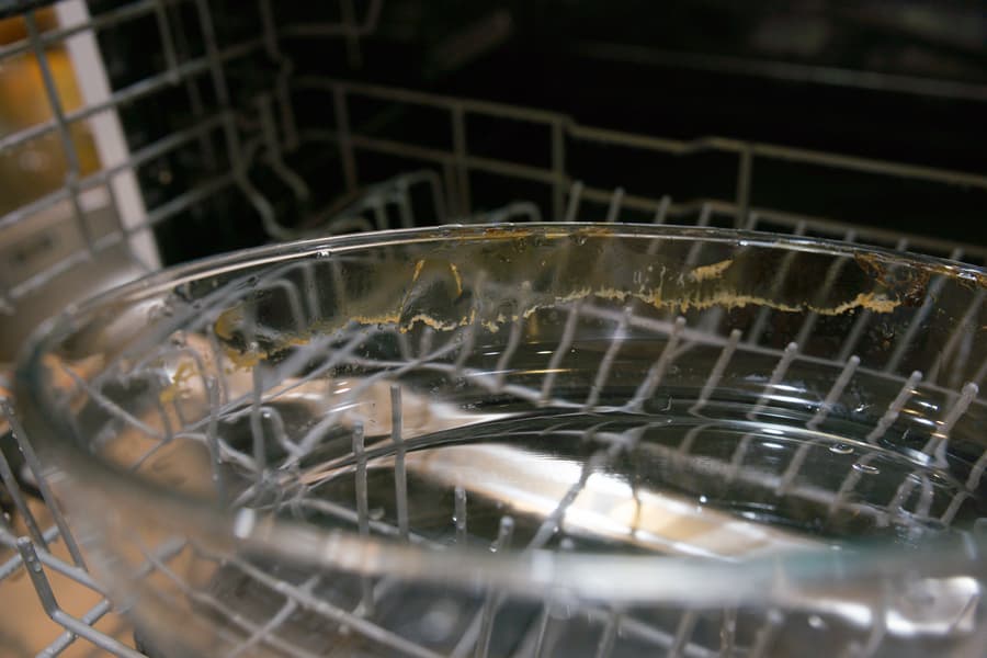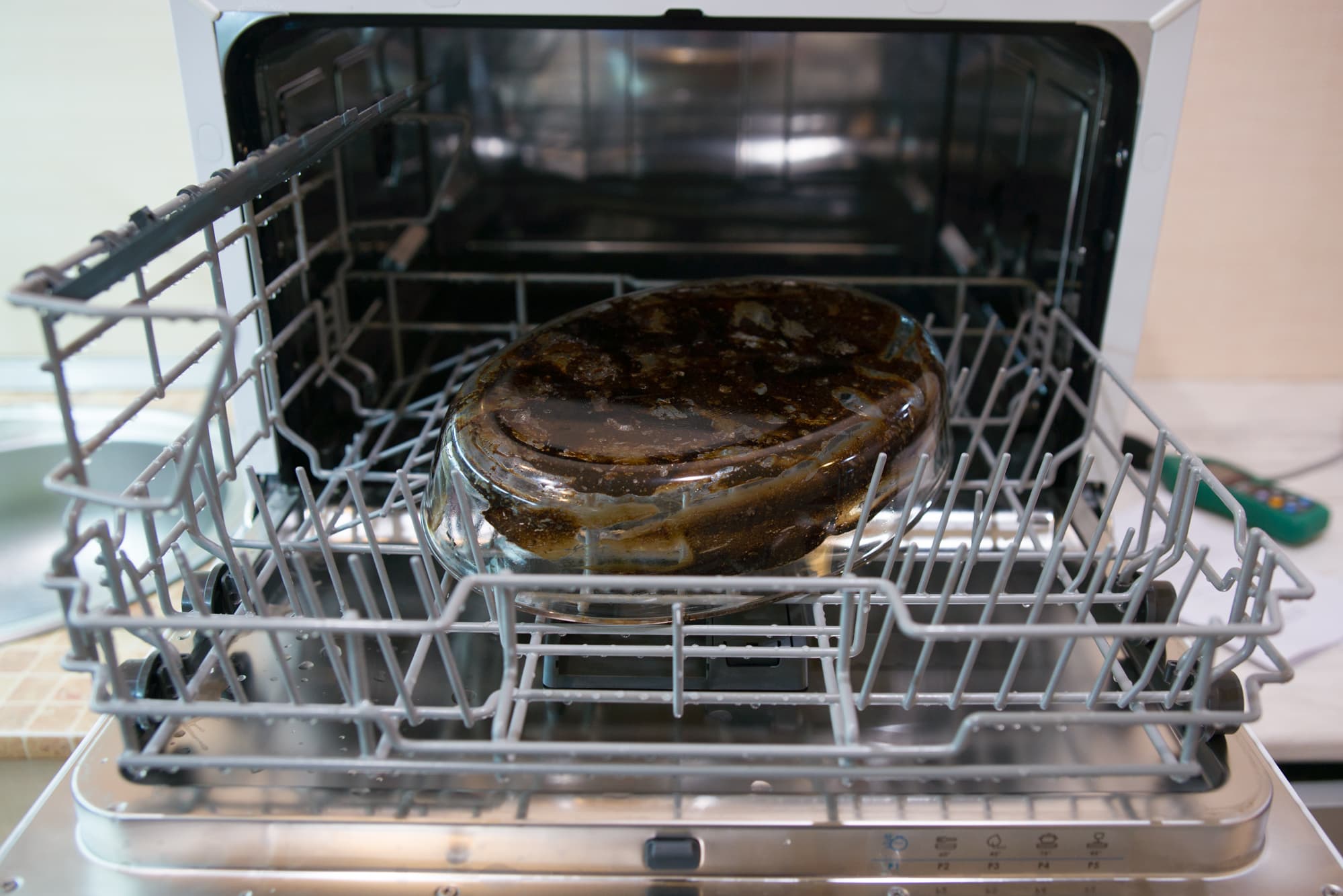 Здравый смысл подсказывал замочить форму на пару часов, но нам нельзя — у нас задание всё усложнить. Так что поместили как есть в середину корзины и включили посудомойку на программе для интенсивной мойки (Р4).