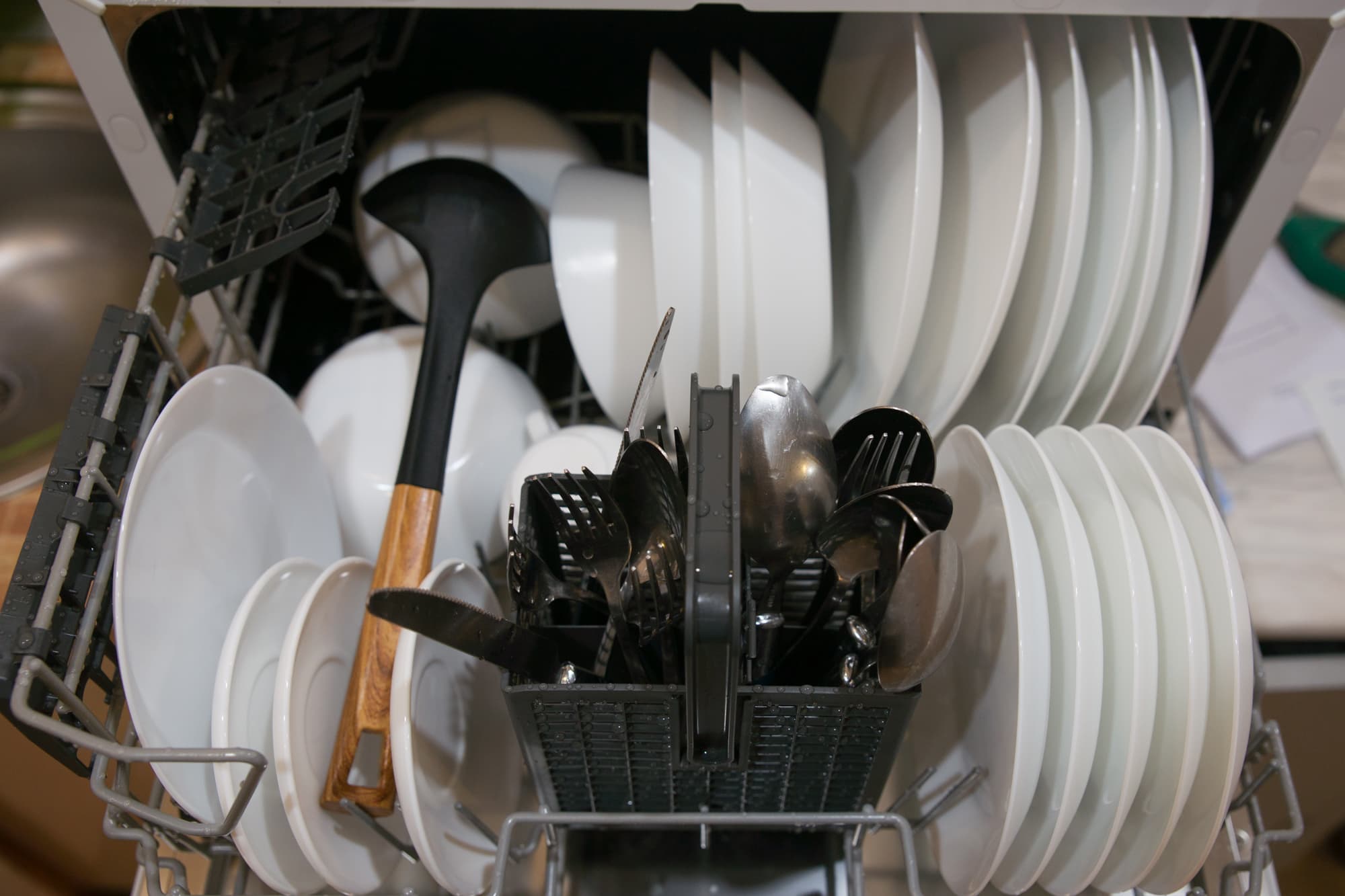 Качество сушки нас вполне удовлетворило: незначительное количество капель было обнаружено только на столовых приборах (не на всех) и на паре больших тарелок.