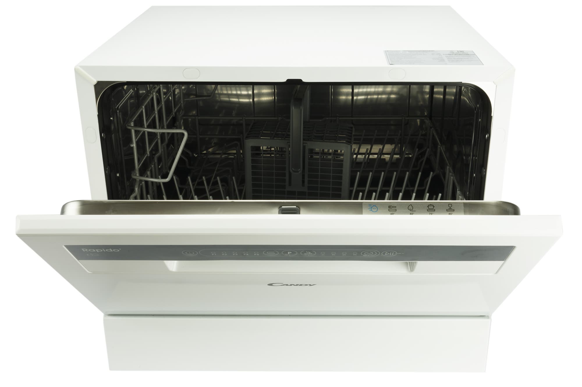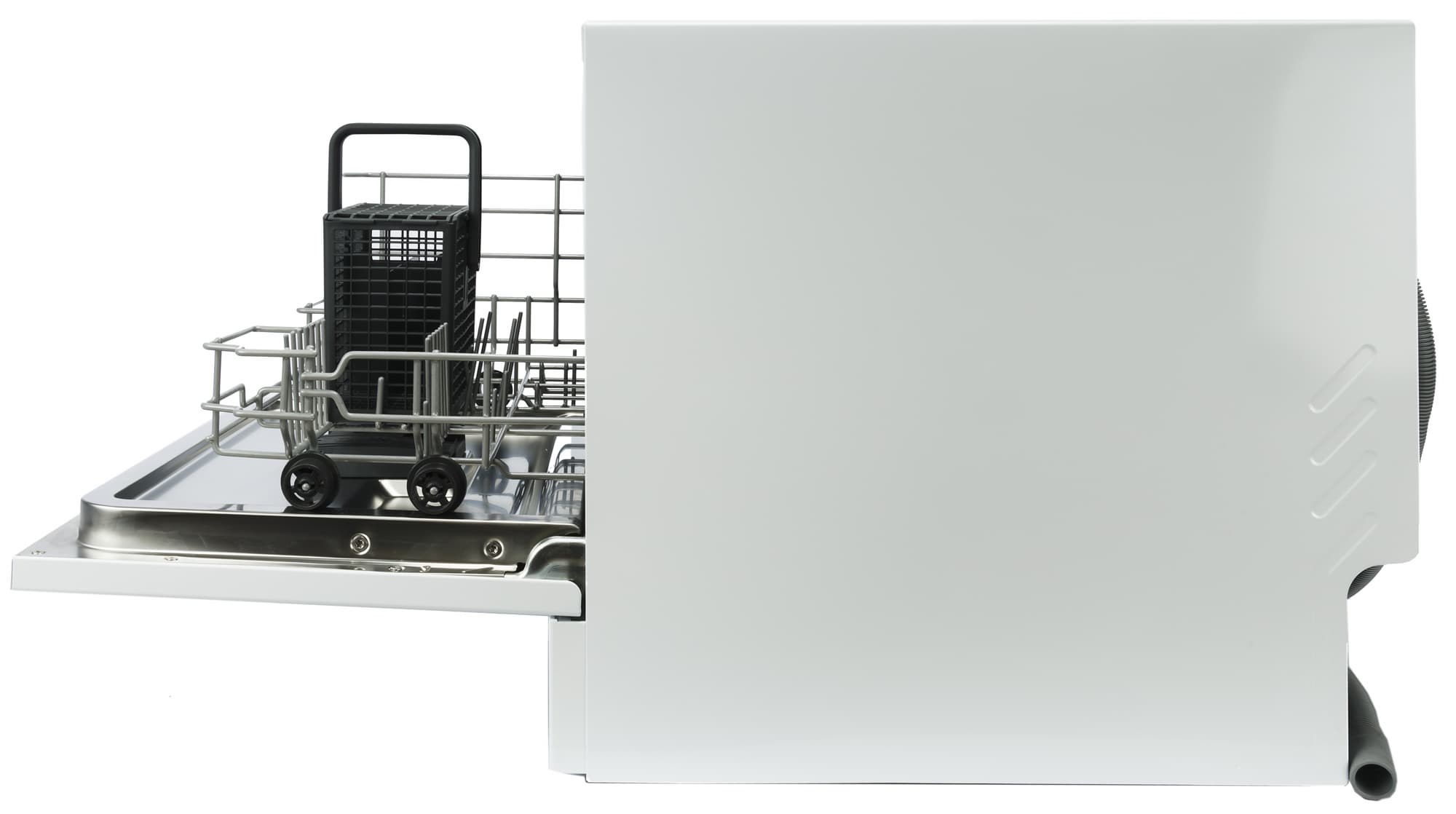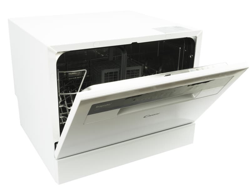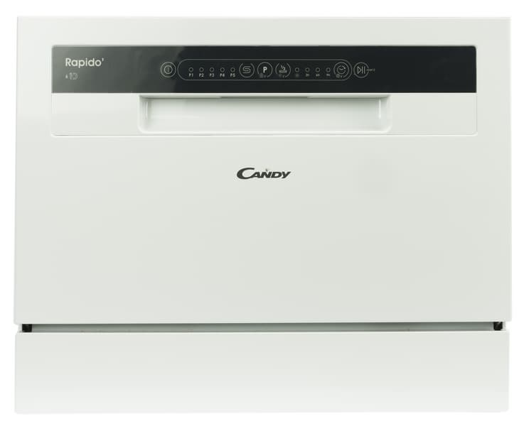 Если встроить посудомоечную машину в кухонный гарнитур или поставить полноразмерную отдельностоящую модель возможности нет, а мыть посуду руками совсем не хочется, есть решение — компактное настольное устройство, такое как Candy CP 6F51LW-08.