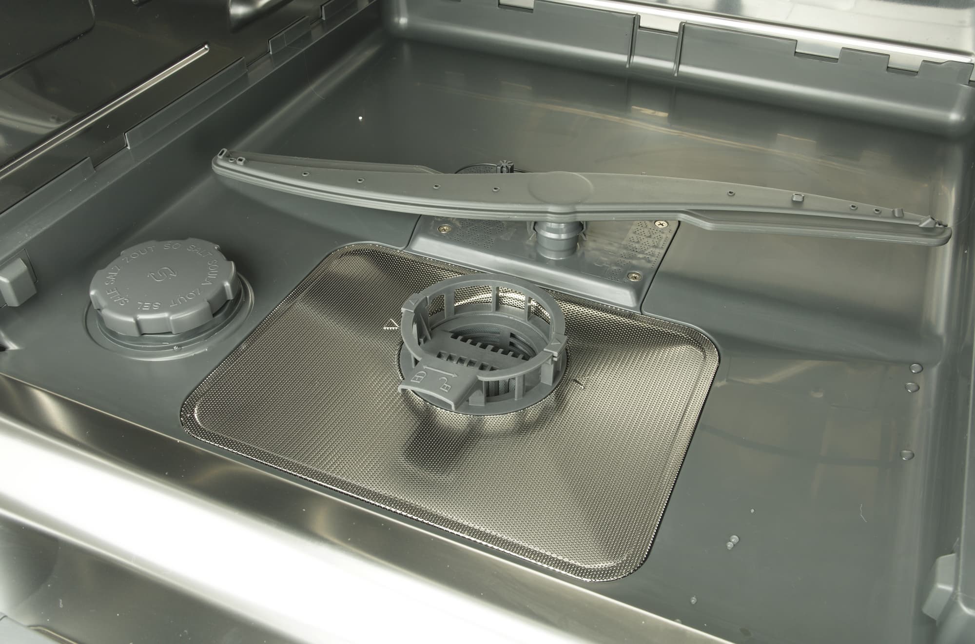 Под корзиной расположились: разбрызгиватель (в этой модели он один), съемный фильтр и отсек для соли. Разбрызгиватель имеет слегка изогнутую форму. Вращение элемента достигается за счет напора воды, выходящей из отверстий, ориентированных под различными углами.