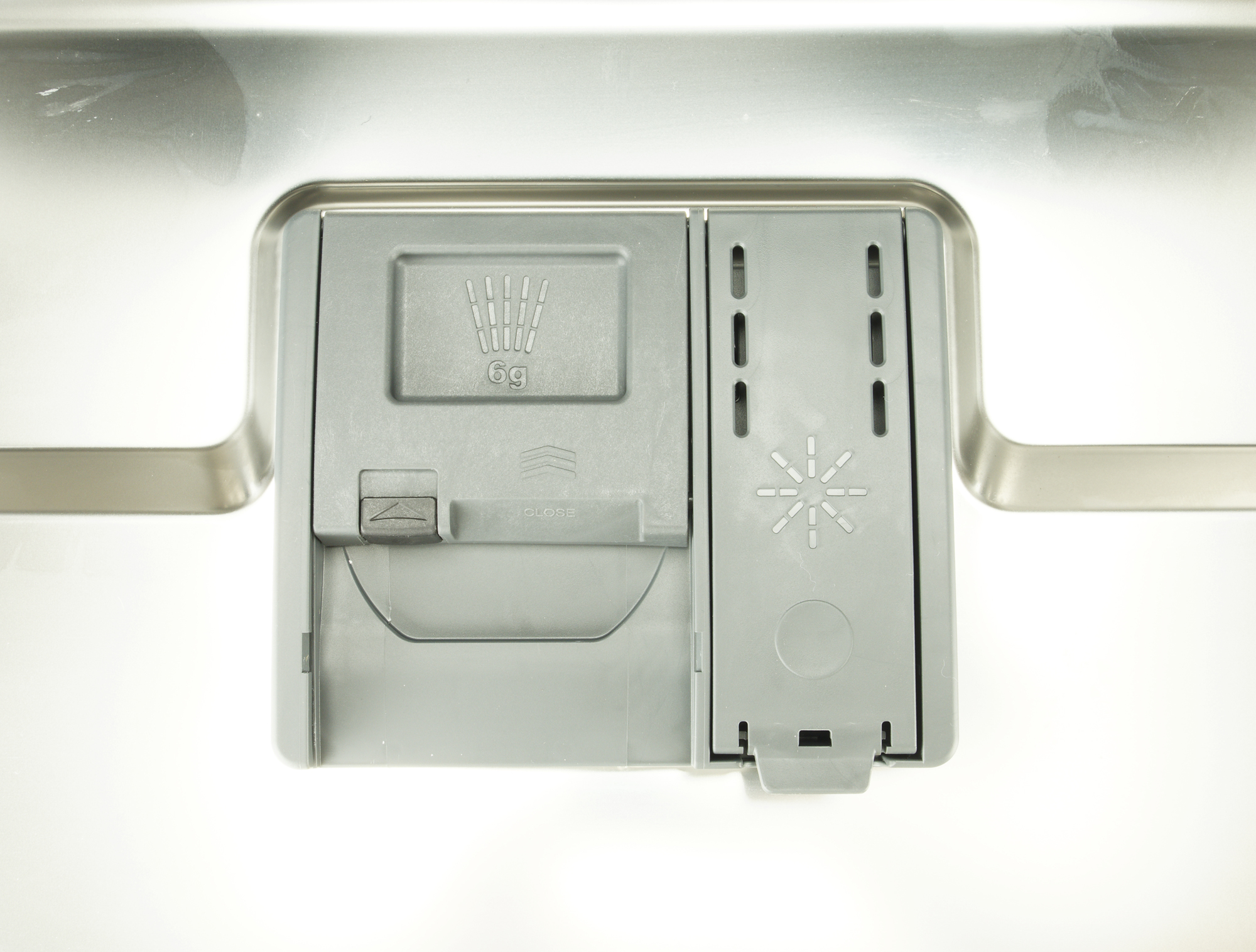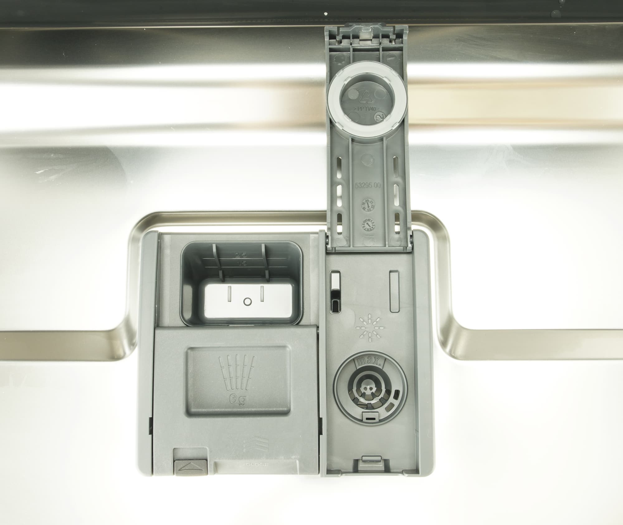 Контейнер для моющих средств расположен на дверце и состоит из двух отсеков: слева за откидывающейся крышкой — отсек для порошка или таблеток, справа под крышкой — емкость для ополаскивателя. Расход средства регулируется кнопками на панели управления.