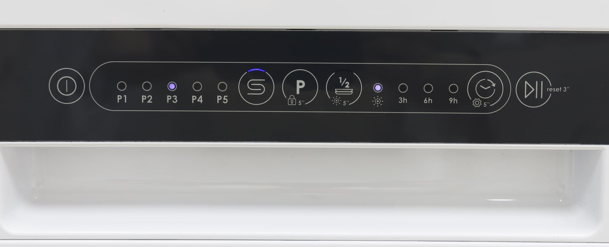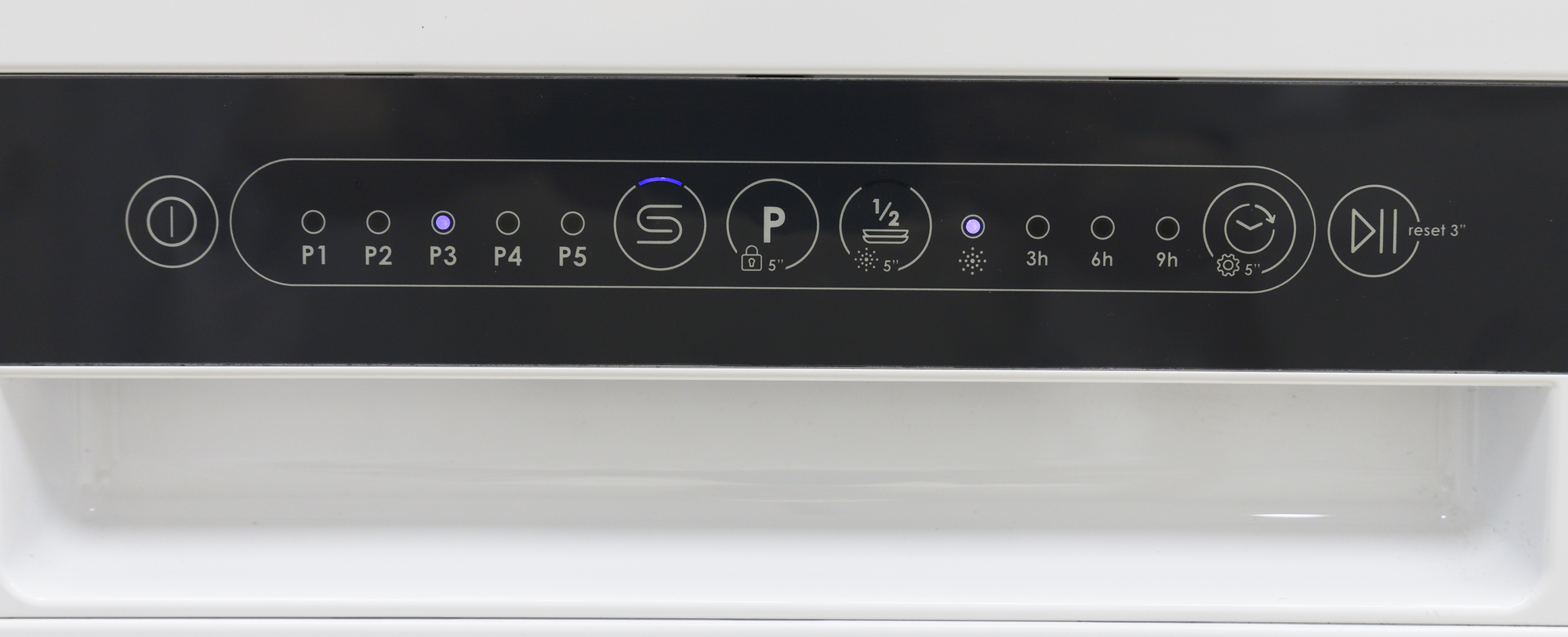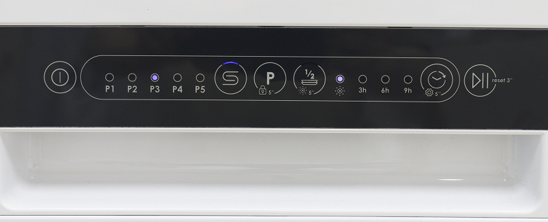По бокам от кнопки Р находятся индикаторы соли и ополаскивателя, последний также отображает частичную загрузку, если таковая была выбрана перед запуском цикла.
