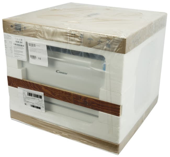 Посудомоечная машина Candy CP 6F51LW-08 поставляется в упаковке из пенопласта и картона, обтянутой прочным полиэтиленом. По центру фронтальной части конструкция усилена деревянной планкой. На лицевой части размещены наклейки с информацией об устройстве.
