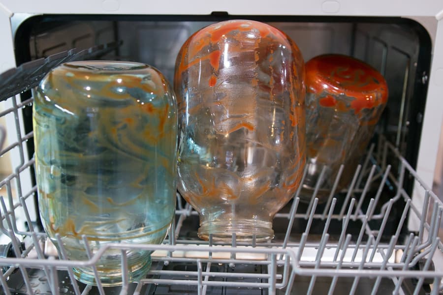 Для тестирования программы Eco мы взяли несколько крупных банок: пару двухлитровых и одну трехлитровую. Запачкали их изнутри кетчупом (на этот раз без майонеза) и дали высохнуть в течение суток.