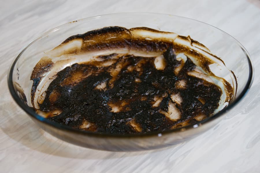 Как показал опыт, для программы отмывания интенсивных загрязнений лучше всего подходит форма, в которой готовили курицу со сметанным соусом. После того как всё было съедено, форму поставили в духовку под сильный гриль минут на 15. Этого было достаточно, чтобы образовался толстый изрядно пригоревший слой.