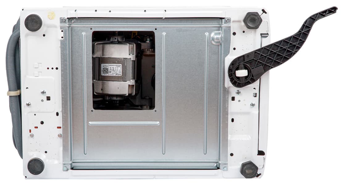В центре нижней панели расположено технологическое отверстие, открывающее доступ к мотору и приводу без дополнительной разборки устройства. Стиральная машина поставляется с открытым отверстием, при установке оно должно быть закрыто прилагаемой пластиковой заглушкой.